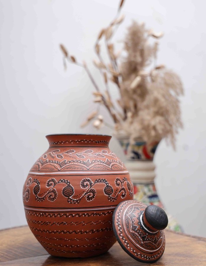 Handpainted Terracotta Heritage Pot With Intricate Tribal Motifs and Traditional Lid- Kutch Pottery