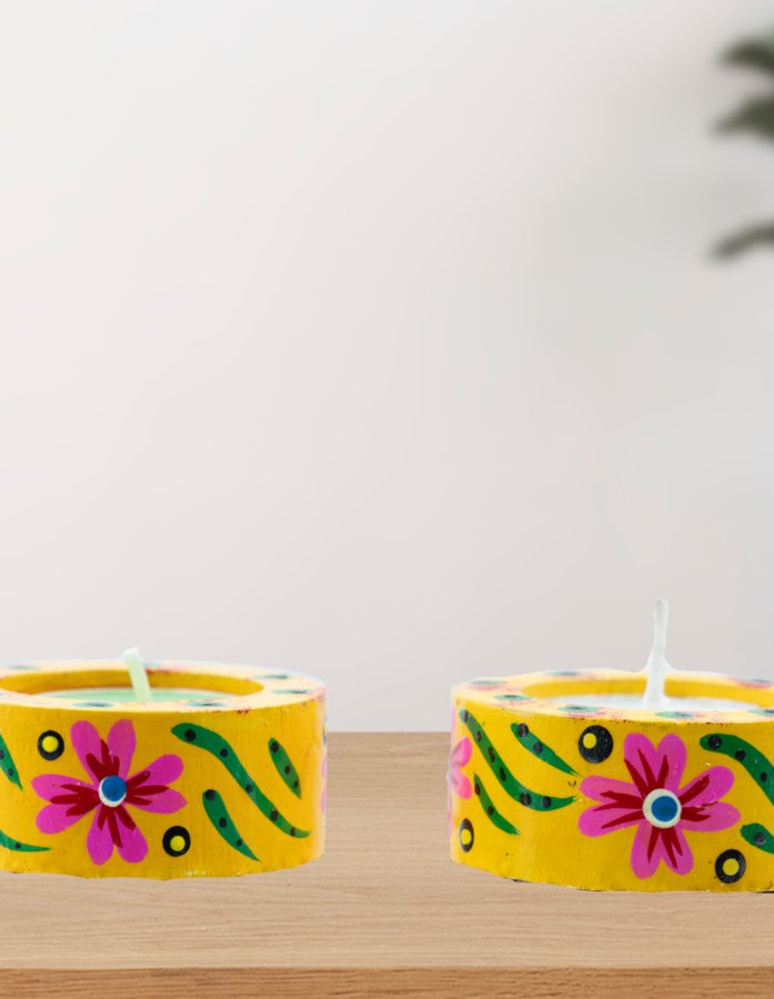 Pair Of Yellow Wooden Handpainted Tea Light Candle Holder