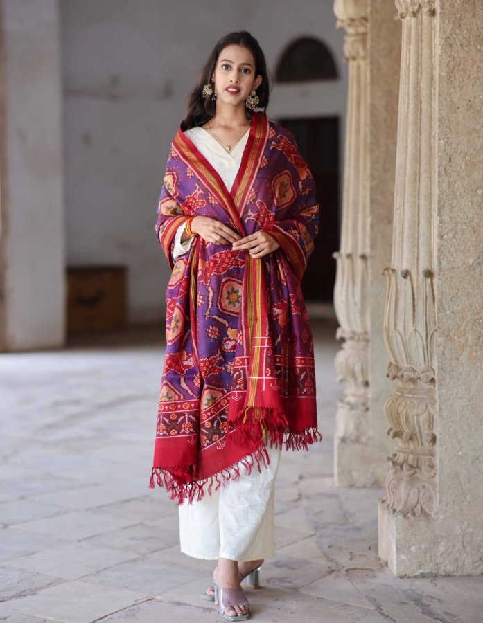 Striking Red And Blue Patan Patola Single Ikkat Dupatta