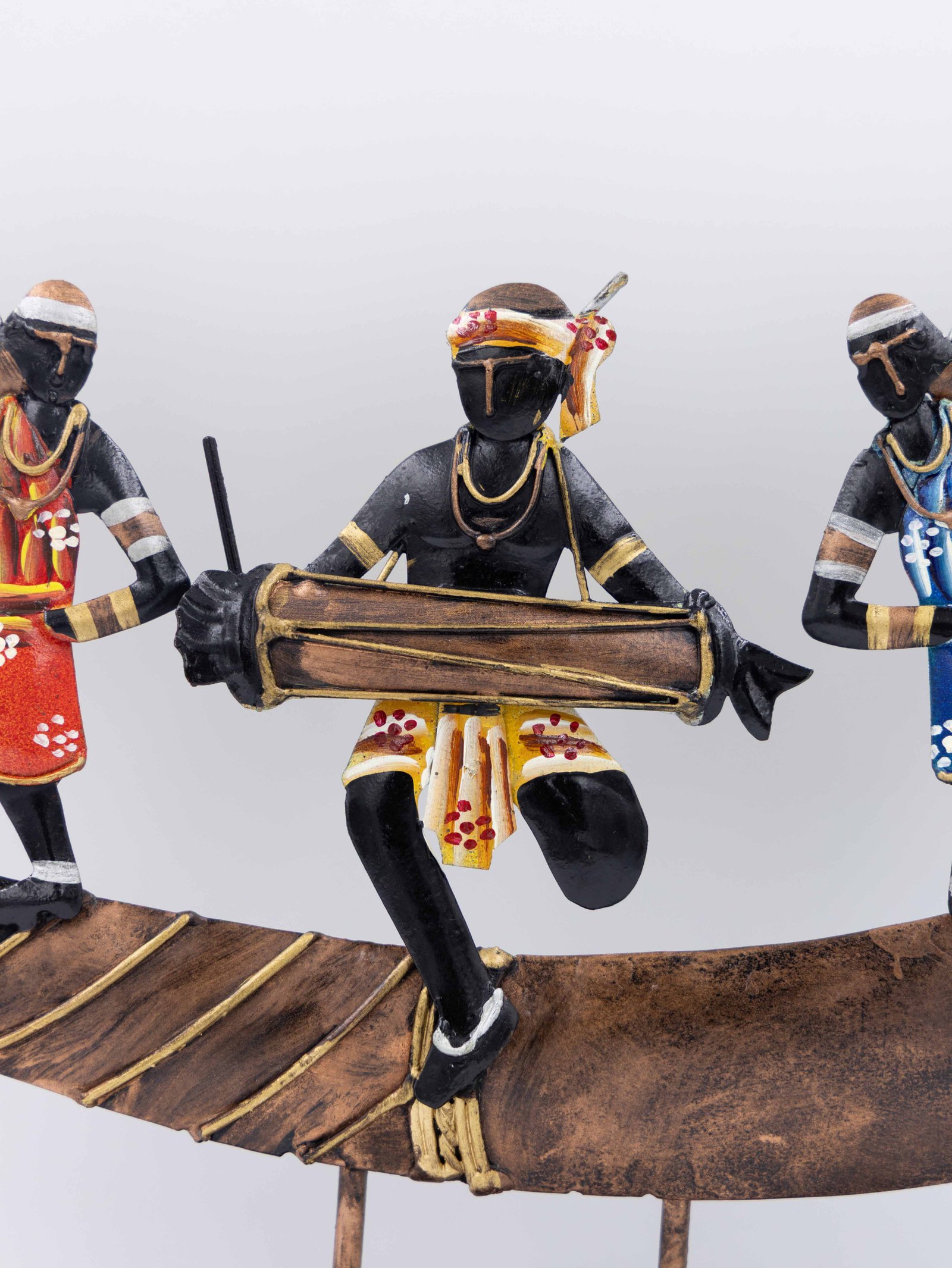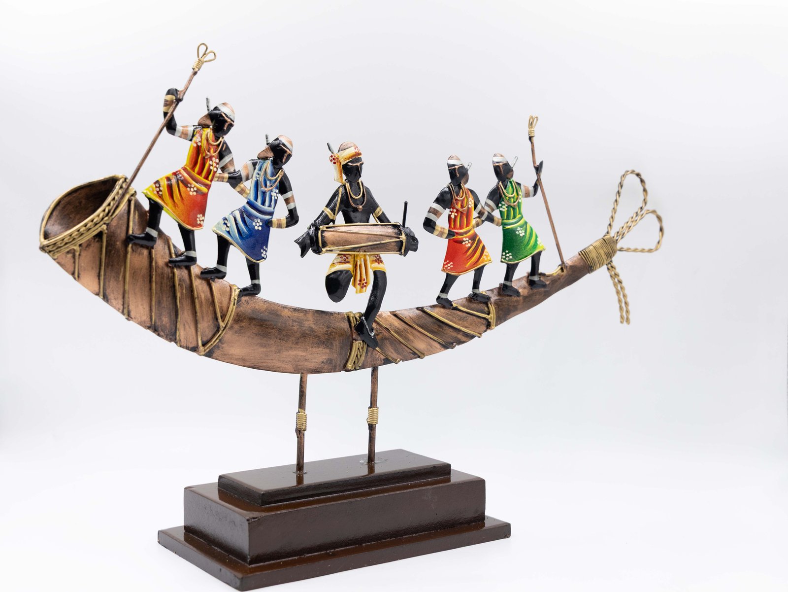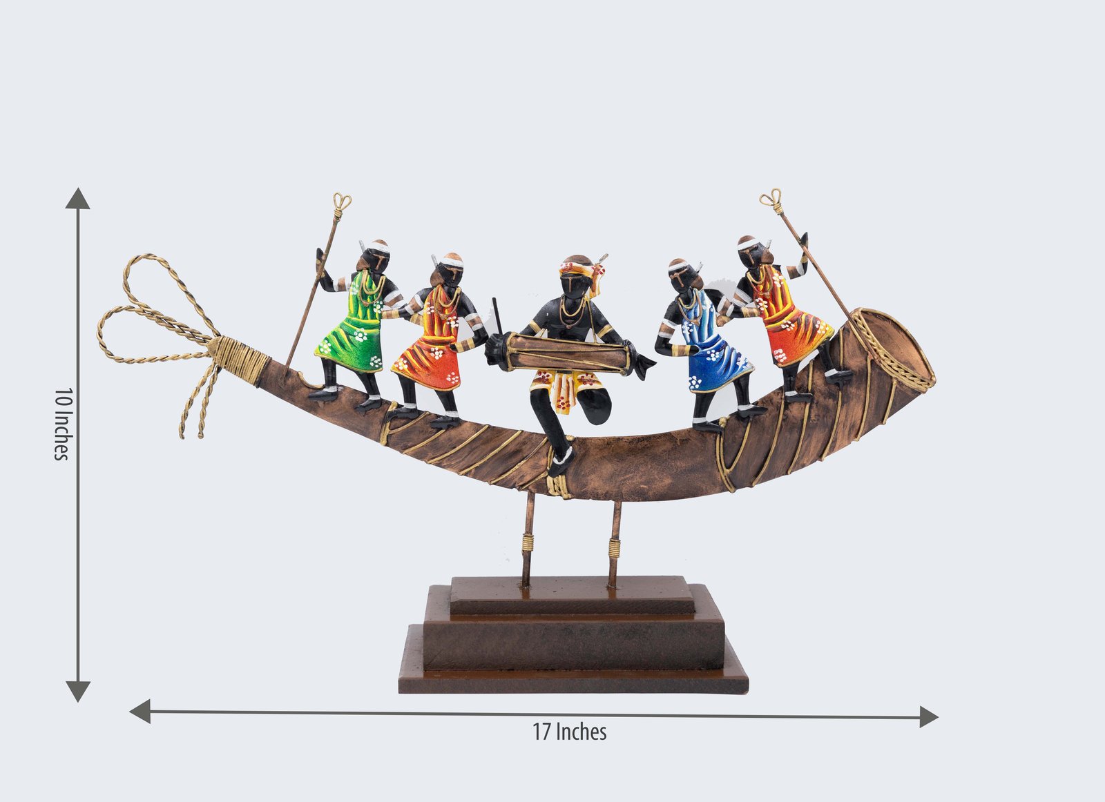 Infuse your space with a set of Handmade Antique Iron Showpieces! It shows a vibrant scene of tribal figures on a traditional boat. The long boat structure is creatively constructed from iron and is supported by strong rectangular bases. The figures within are represented in vibrant attire, including reds, greens, blues, and oranges. They appear to be playing musical instruments or sailing, which creates a dynamic representation of a festive journey. The centerpiece of any room is a striking and joyful piece that seamlessly integrates cultural narrative, movement, and color.