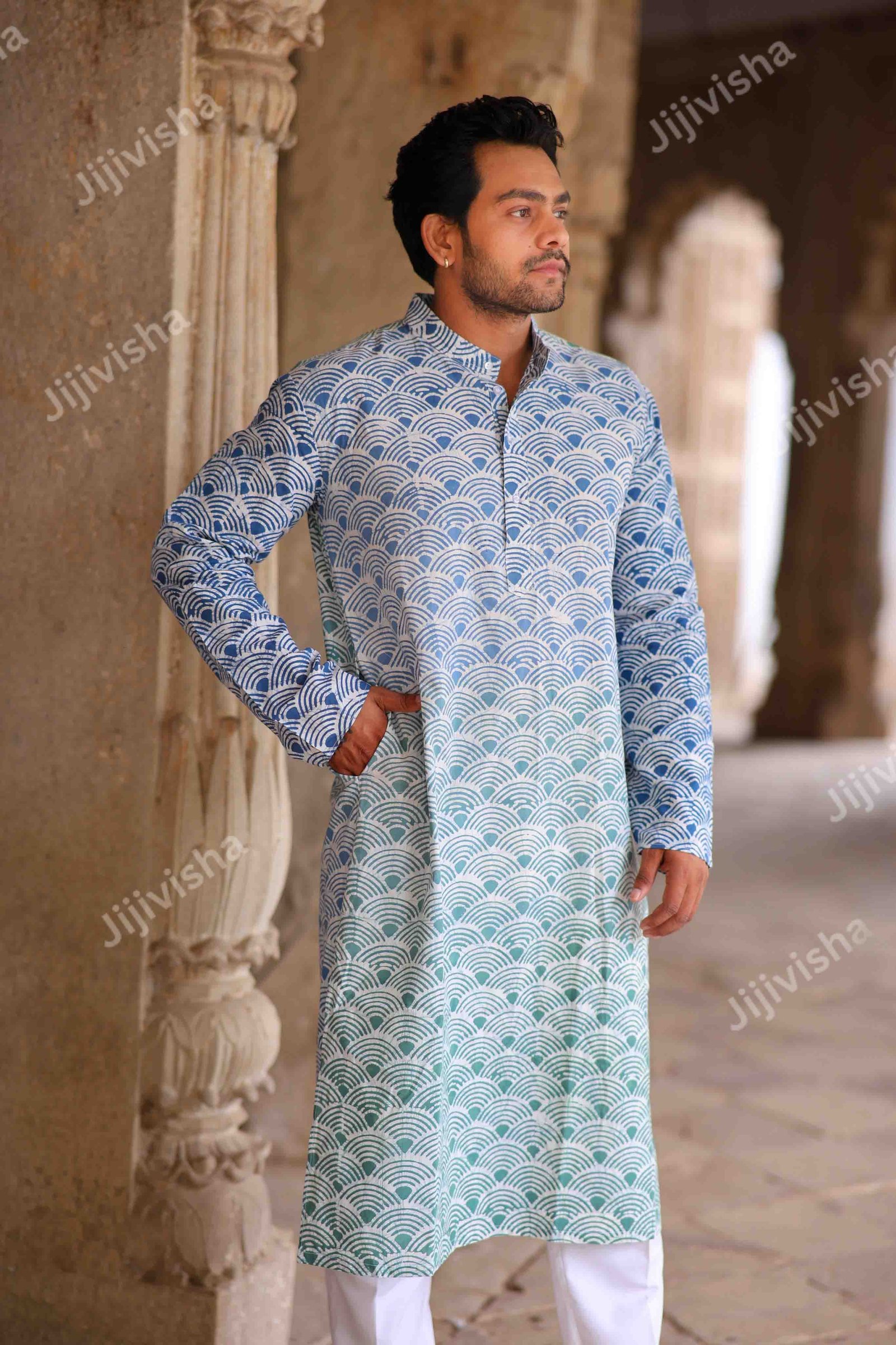 • Handcrafted with love and care, each kurta is a testament to the artistry of traditional block printing techniques, passed down through generations. The intricate wave patterns dance across the ivory base, creating a harmonious blend of elegance and relaxation.