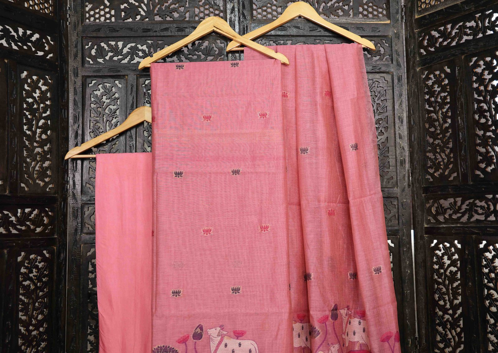 The Jijivisha Collection introduces a beautiful Kurta Set in luxurious Chanderi fabric in a soft pink color, offering a blend of tradition and elegance. The set includes a stunning kurta, matching pants, and a graceful dupatta, making it a complete ensemble for any occasion. The kurta panel and dupatta are adorned with intricate floral Jamdani work, featuring motifs of cows and lotus flowers, symbolizing prosperity and peace. The delicate weaving technique of Jamdani brings out the beauty of these motifs, adding an artisanal touch to the design. The dupatta is further enhanced with tassels on both sides, adding movement and charm. This ensemble exudes timeless elegance, making it an ideal choice for festive celebrations or cultural gatherings, offering a blend of rich heritage and modern style.