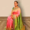 1. Drape yourself in the allure of the “Hibiscus Harlequin: Light Pink Bishnupur Pure Katan Silk Kotki Saree”. Like a whisper of spring’s first bloom, this exquisite masterpiece celebrates femininity in its purest form. This saree transcends mere clothing; it embodies a symphony of elegance and artistry, enveloping the wearer in a tapestry of sophistication. The intricate kotki weave adorns the pure katan silk, giving rise to a captivating texture that is a feast for both the senses and the soul. The enchanting hue of light pink, reminiscent of blushing petals kissed by dawn’s gentle light, casts a spell of timeless allure.