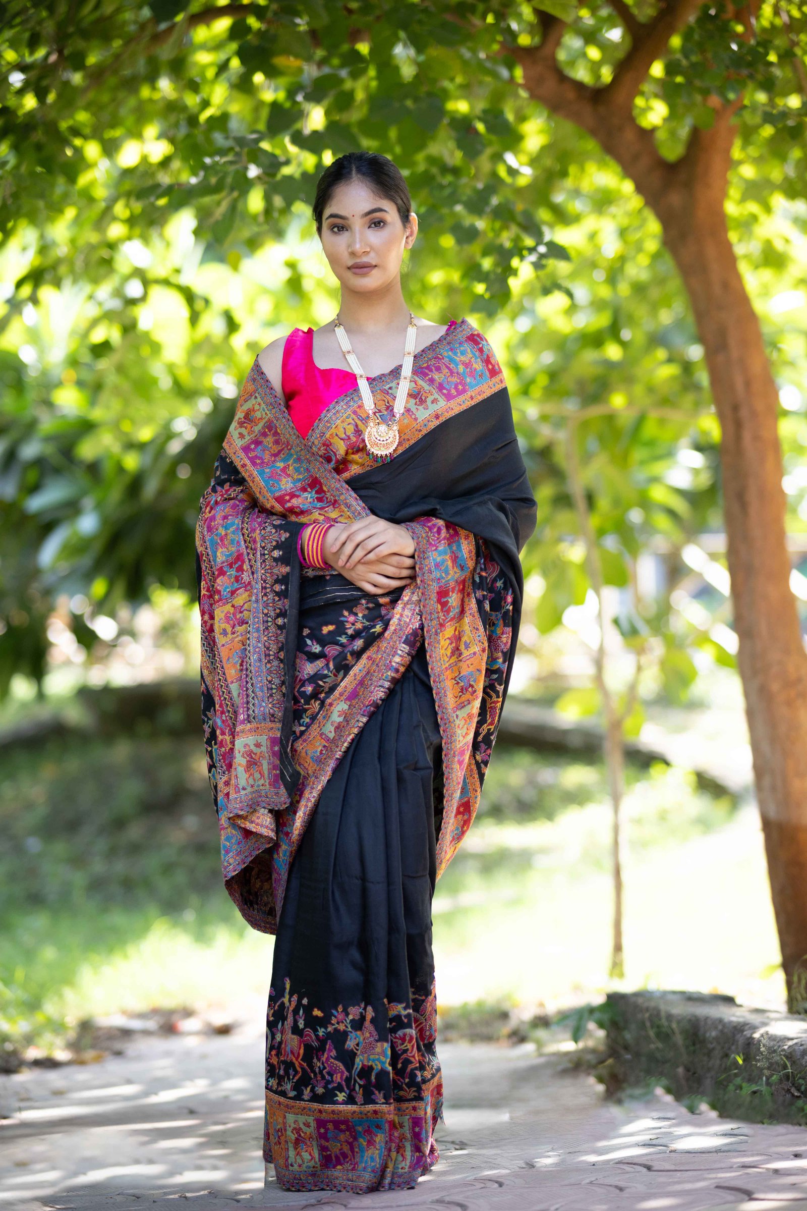 Drape yourself in the beauty of this Black Saree with multi-coloured Woven Border & Pallu - Horse Riding Warrior Motifs all over the pallu from Jijivisha, available online in India, where tradition and art come together in perfect harmony. The deep black fabric forms a stunning backdrop for the multi-coloured weave that adorns the border and pallu, adding vibrant charm. The horse-riding warriors woven into the design with Resham and Zari symbolize strength, bravery, and royal heritage, making this saree a reflection of timeless tradition. Whether worn for a special occasion or treasured for years to come, this saree is a celebration of culture, grace, and lasting beauty.