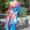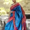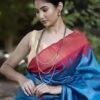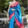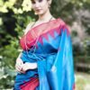 Dazzle at any celebration with this stunning Handspun-Handwoven Turquoise Blue Kosa silk saree with a red Temple border. The mesmerizing blend of celestial Turquoise blue and fiery red creates a perfect harmony, while the bold temple border ignites a passion for timeless beauty. Infused with the warmth of a thousand sunsets, this saree’s temple border blazes with fiery brilliance, woven with the passion and love of skilled artisans. As you wrap yourself in its silken folds, the rich threads whisper tales of comfort, luxury, and tradition. Buy now this lightweight luxurious Chanderi saree with woven designs online at Jijivisha, India, and let its timeless elegance elevate your wardrobe.