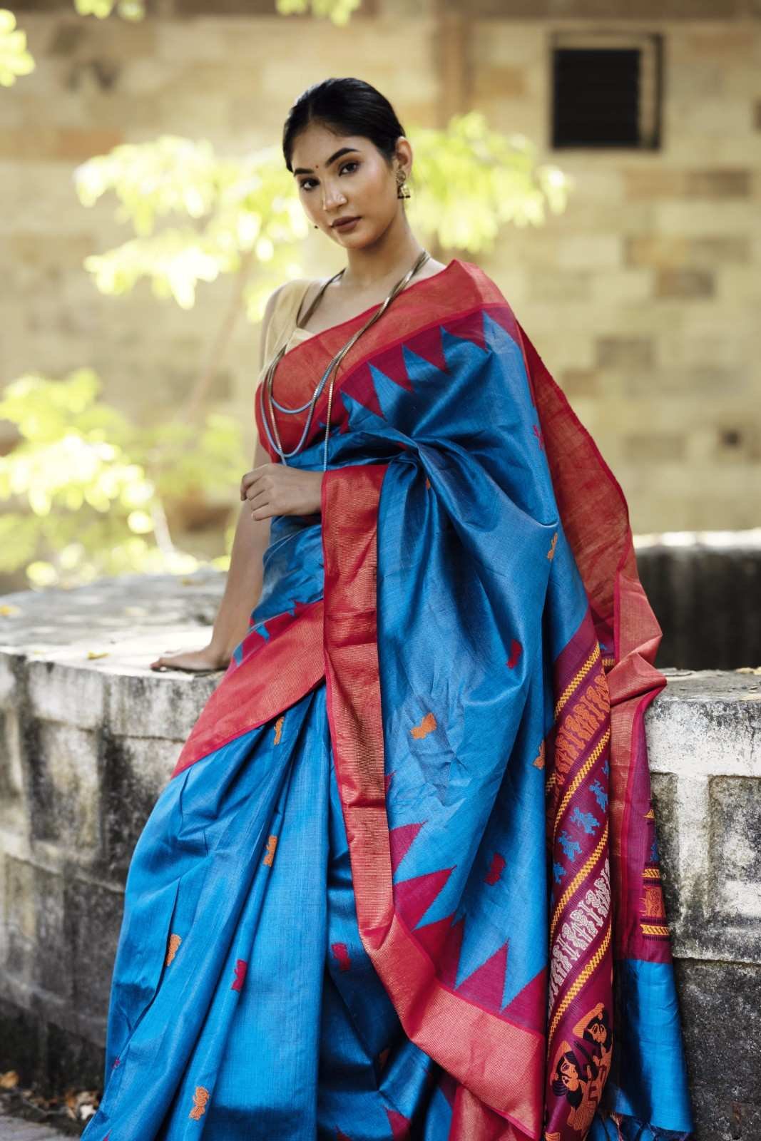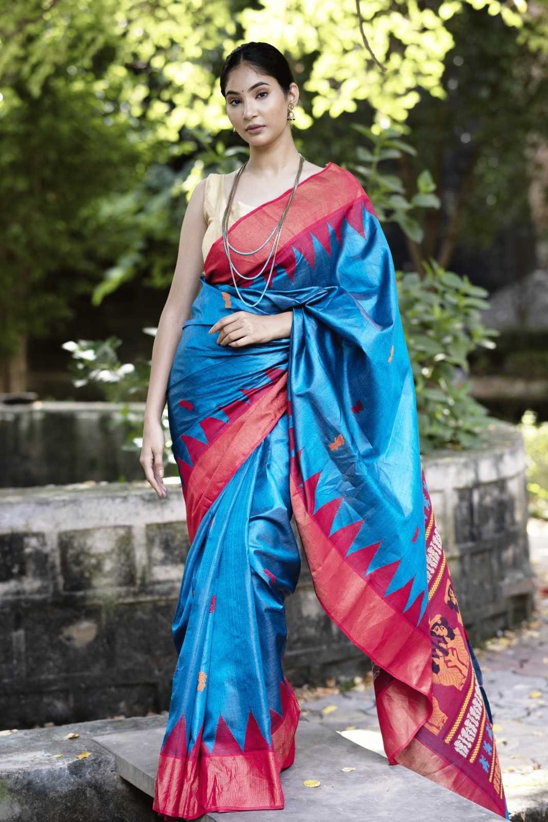 Dazzle at any celebration with this stunning Handspun-Handwoven Turquoise Blue Kosa silk saree with a red Temple border. The mesmerizing blend of celestial Turquoise blue and fiery red creates a perfect harmony, while the bold temple border ignites a passion for timeless beauty. Infused with the warmth of a thousand sunsets, this saree's temple border blazes with fiery brilliance, woven with the passion and love of skilled artisans. As you wrap yourself in its silken folds, the rich threads whisper tales of comfort, luxury, and tradition. Buy now this lightweight luxurious Chanderi saree with woven designs online at Jijivisha, India, and let its timeless elegance elevate your wardrobe.