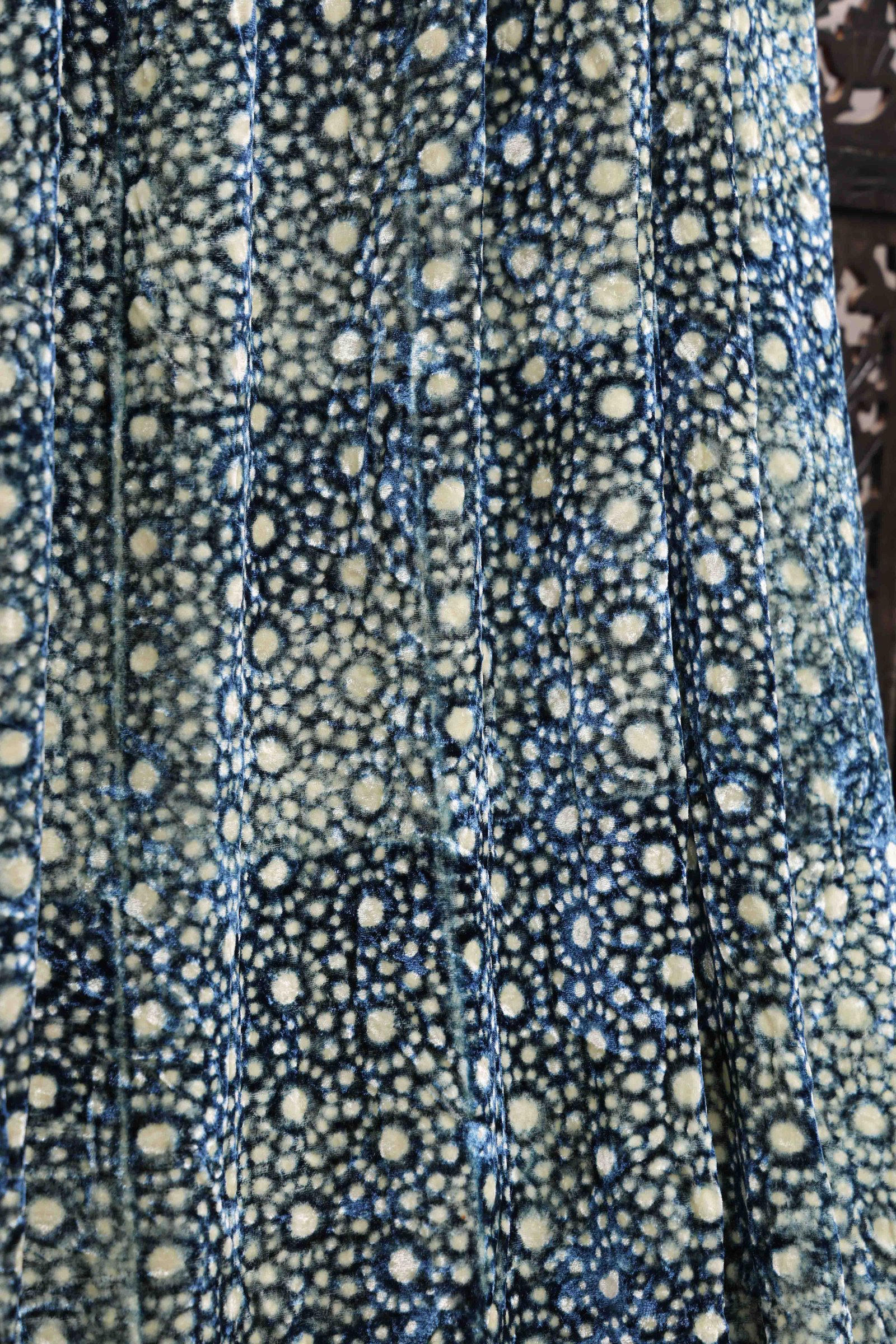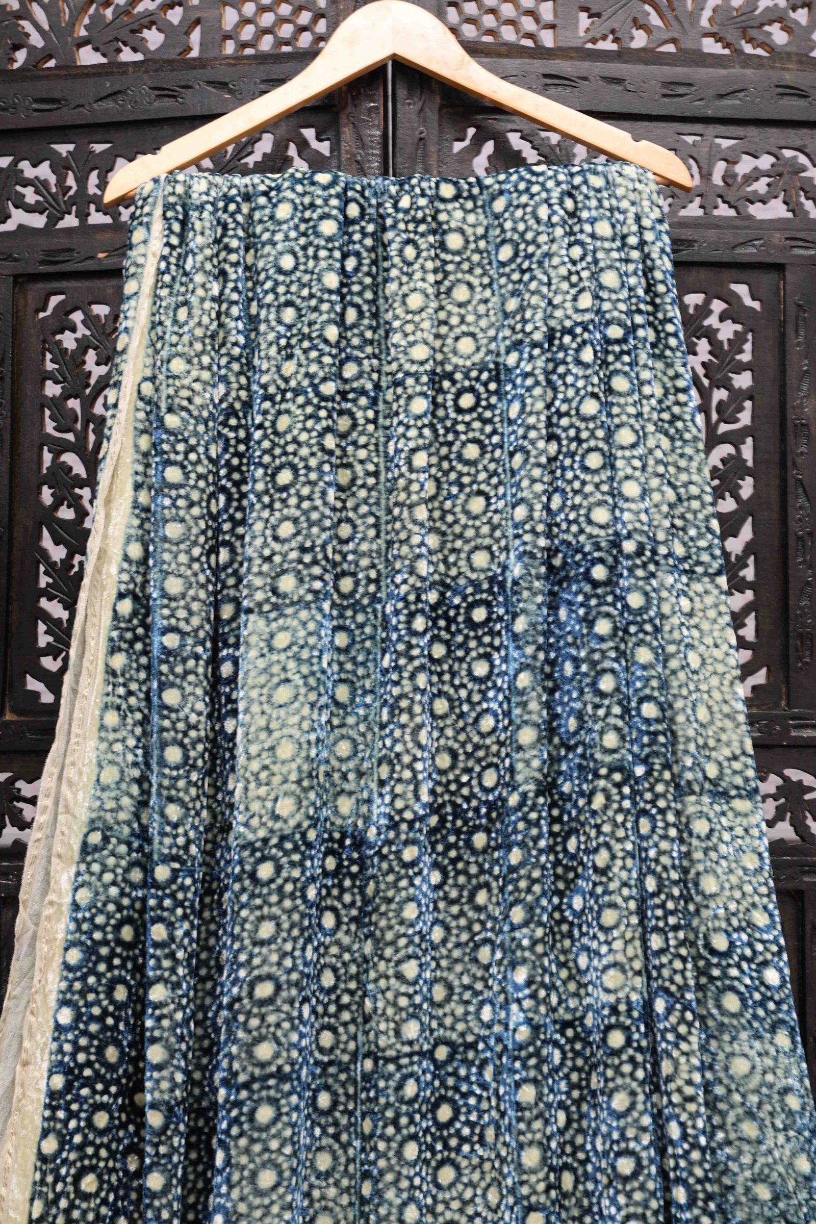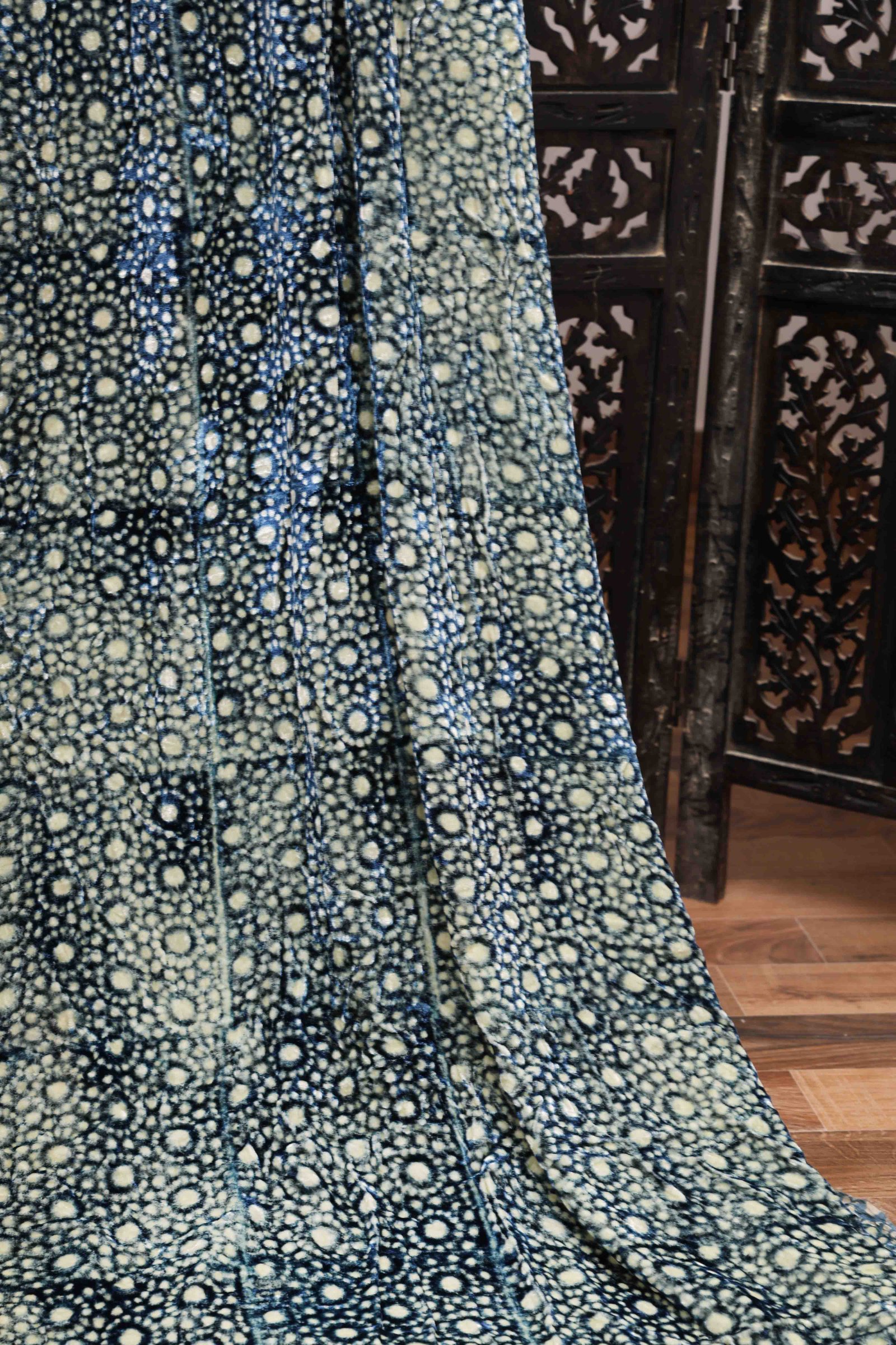 This luxurious blue silk velvet fabric is adorned with intricate Ajrakh Hand Block Prints, crafted using age-old techniques and natural dyes. The rich texture of velvet combined with the deep Indigo blue base gives it a regal and opulent appeal. Traditional Ajrakh motifs, meticulously printed by skilled artisans, lend an ethnic charm and cultural depth to the fabric. The use of natural dyes enhances eco-friendliness. Ideal for statement garments or elegant home décor, this fabric is a celebration of craft tradition