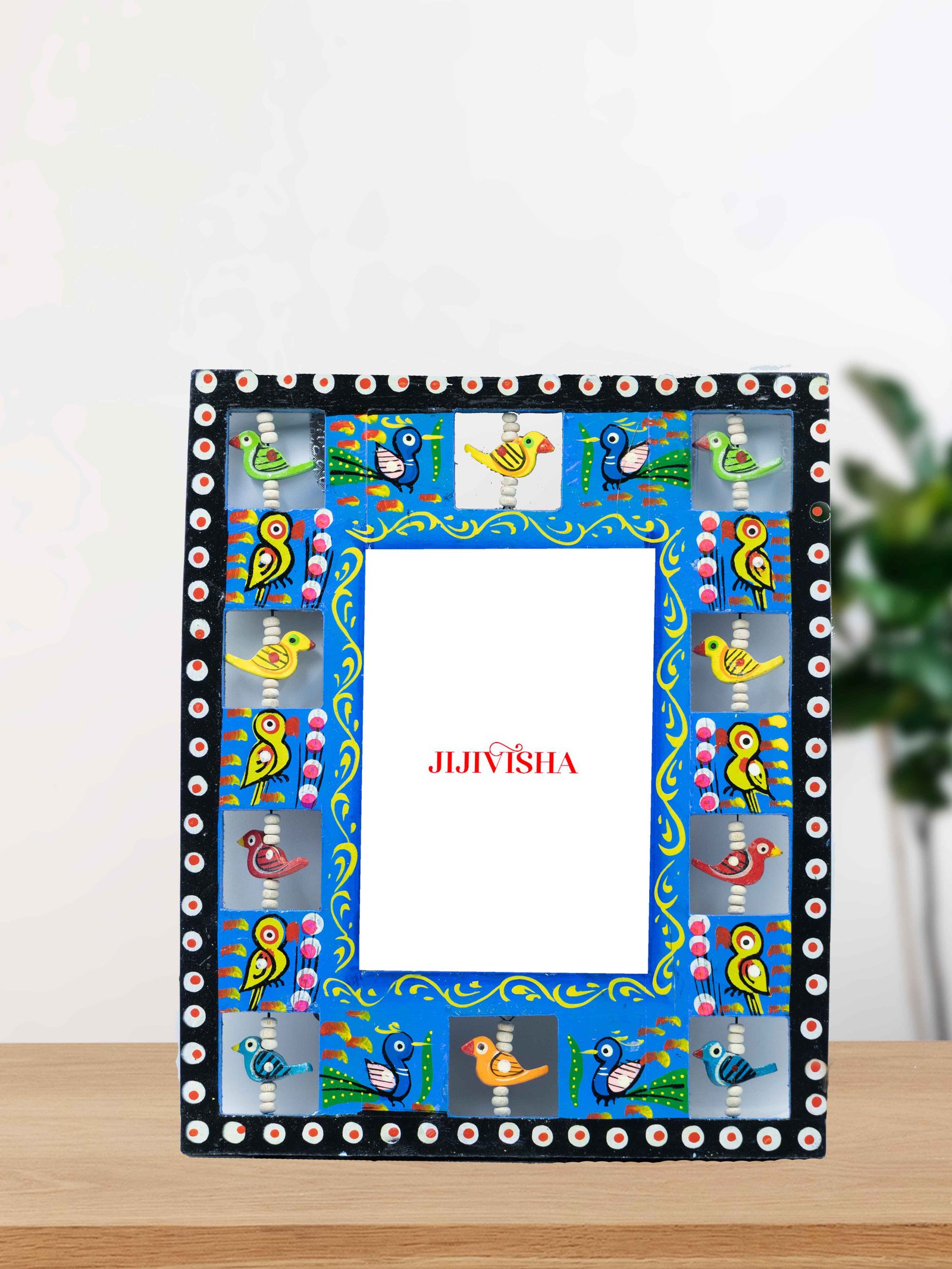 Colorful Art for Your Walls: This Blue Hand-Painted Wooden Photo Frame is a stunning addition to your home decor that will enhance the appeal of your living area. These beautiful wooden photo frames for the wall are the ideal item for showcasing your treasured photographs because it shows a unique combination of traditional craftsmanship and colorful artistry. Against an intense blue backdrop, the frame is embellished with vibrant bird patterns in a variety of striking shades, including yellow, red, and green. Any area is made fresher and happier by the extensive hand-painted accents, which provide a new, creative touch.