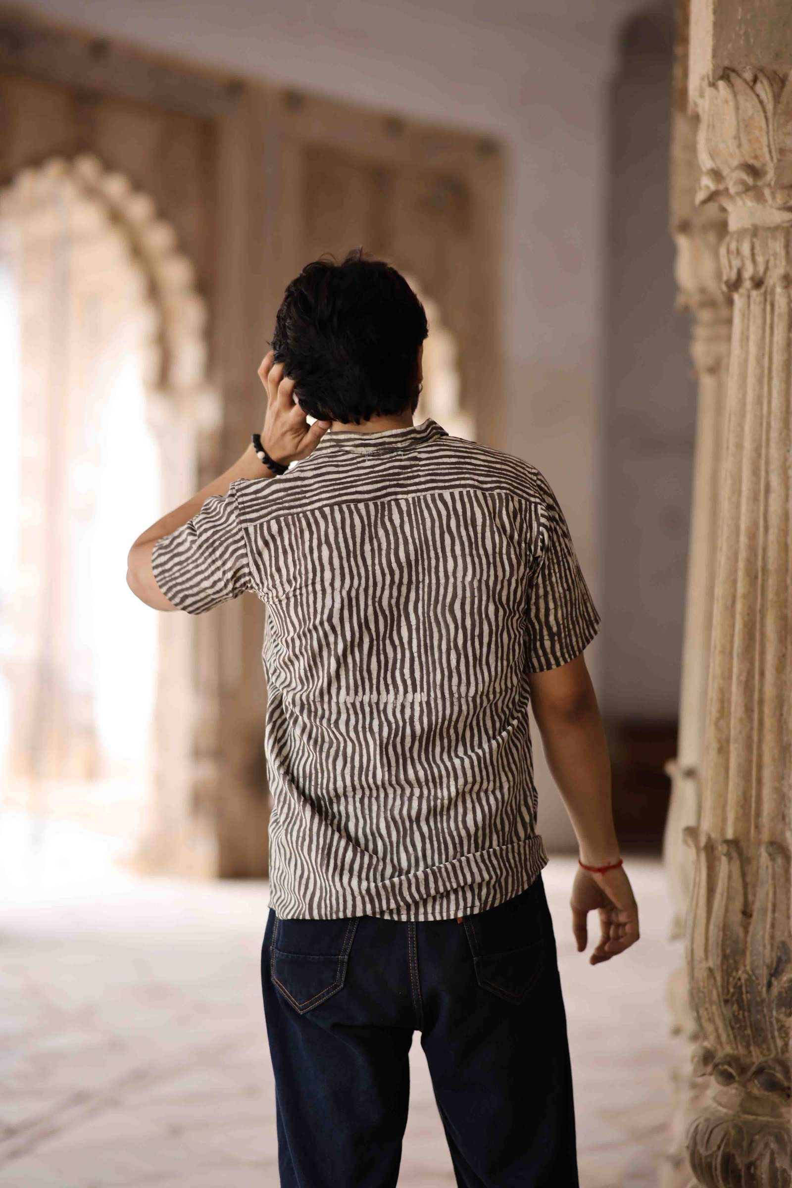 Striped Earthtones: Brown and Beige Hand Block Printed Cotton Half Sleevess Shirt