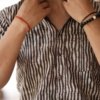 - Featuring brown stripes hand block print on a beige base using natural dyes. You can team it with your favourite linen or cotton trousers