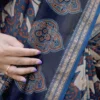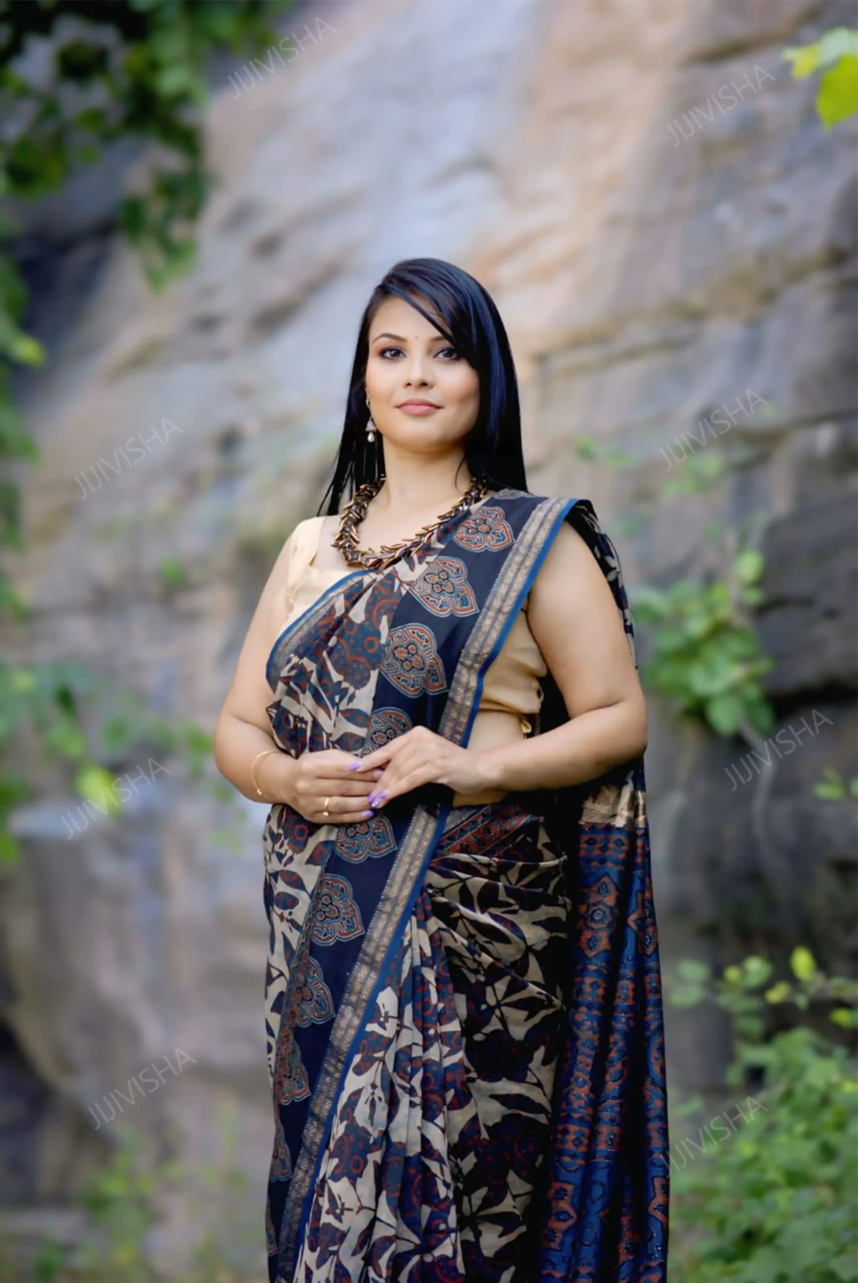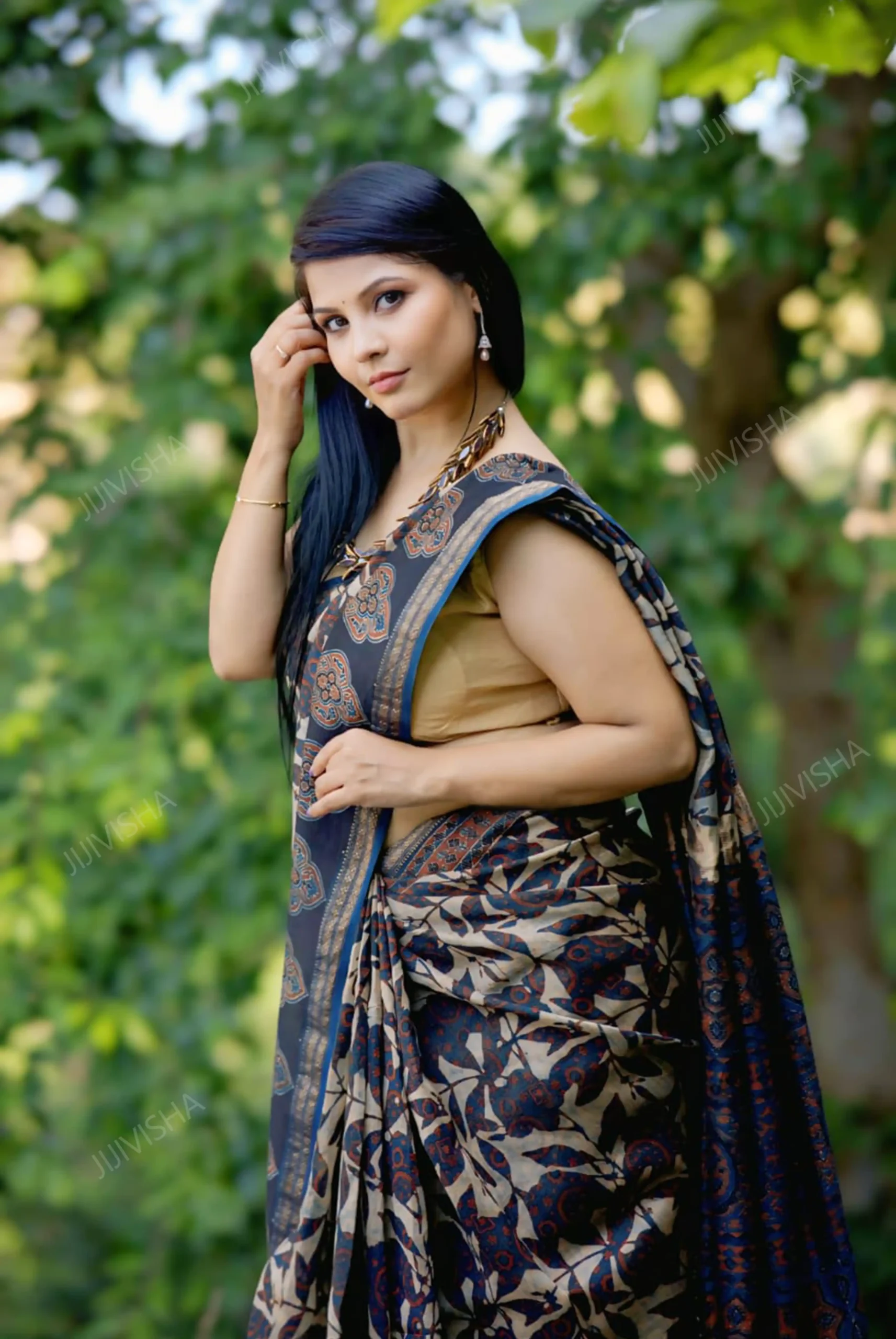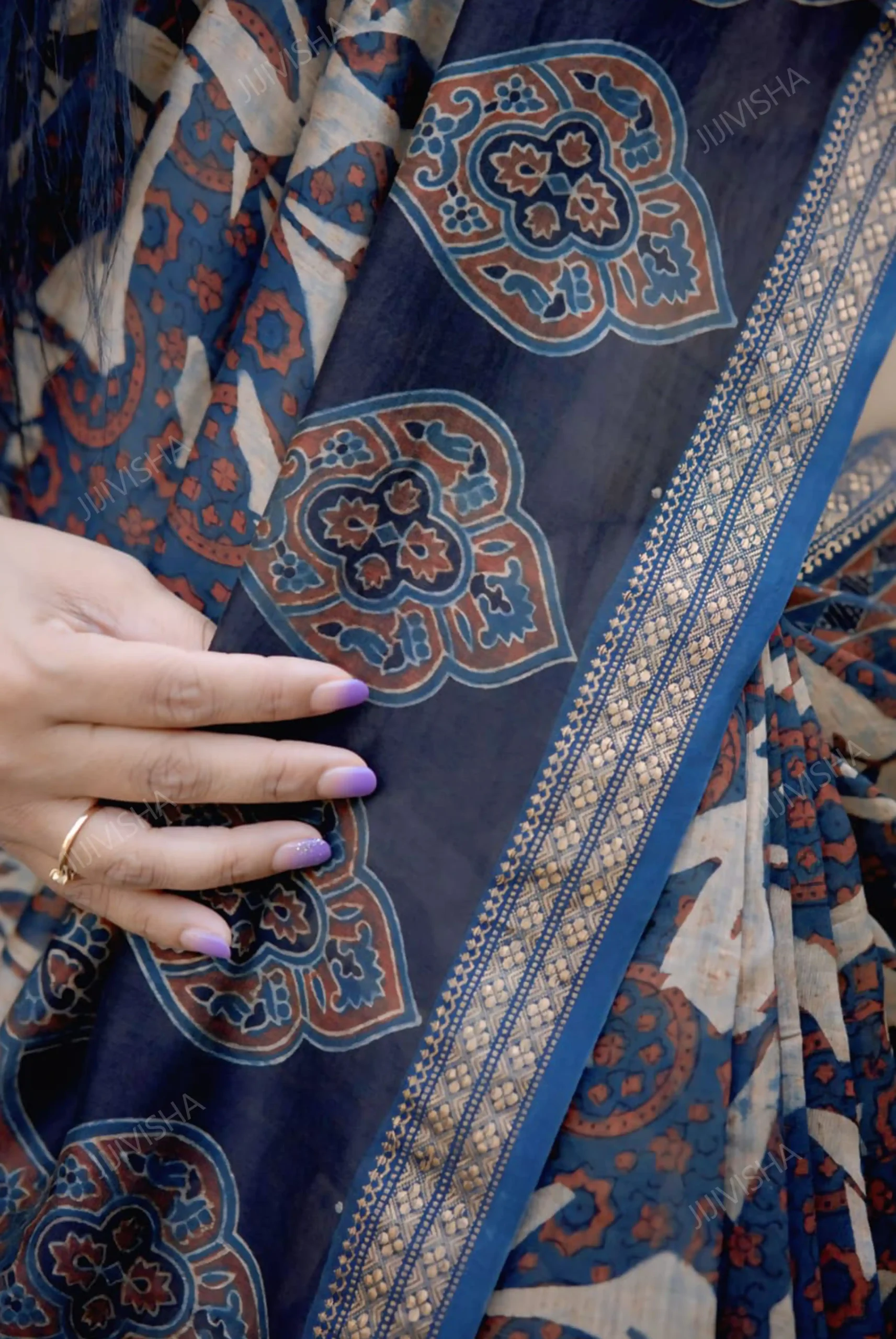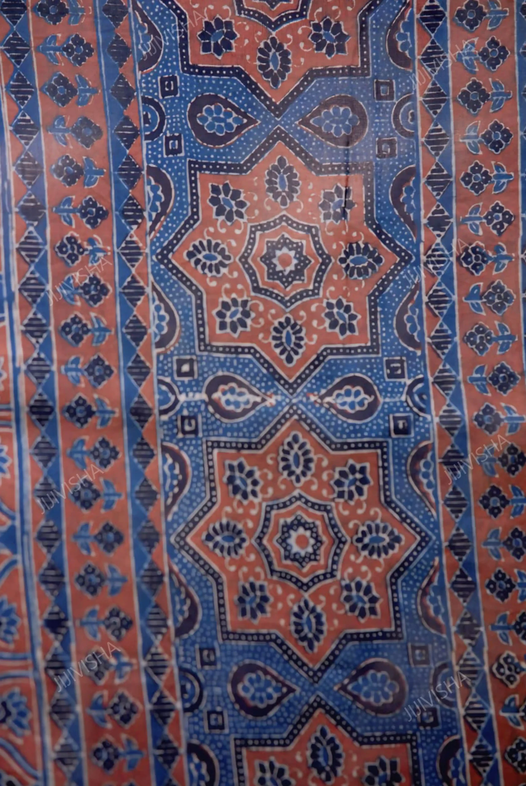 - This saree comes with a complementary blue blouse piece, adding a touch of contrast and versatility to your ensemble. The rich blue hue complements the Ajrakh print beautifully, offering endless possibilities for styling and accessorizing.