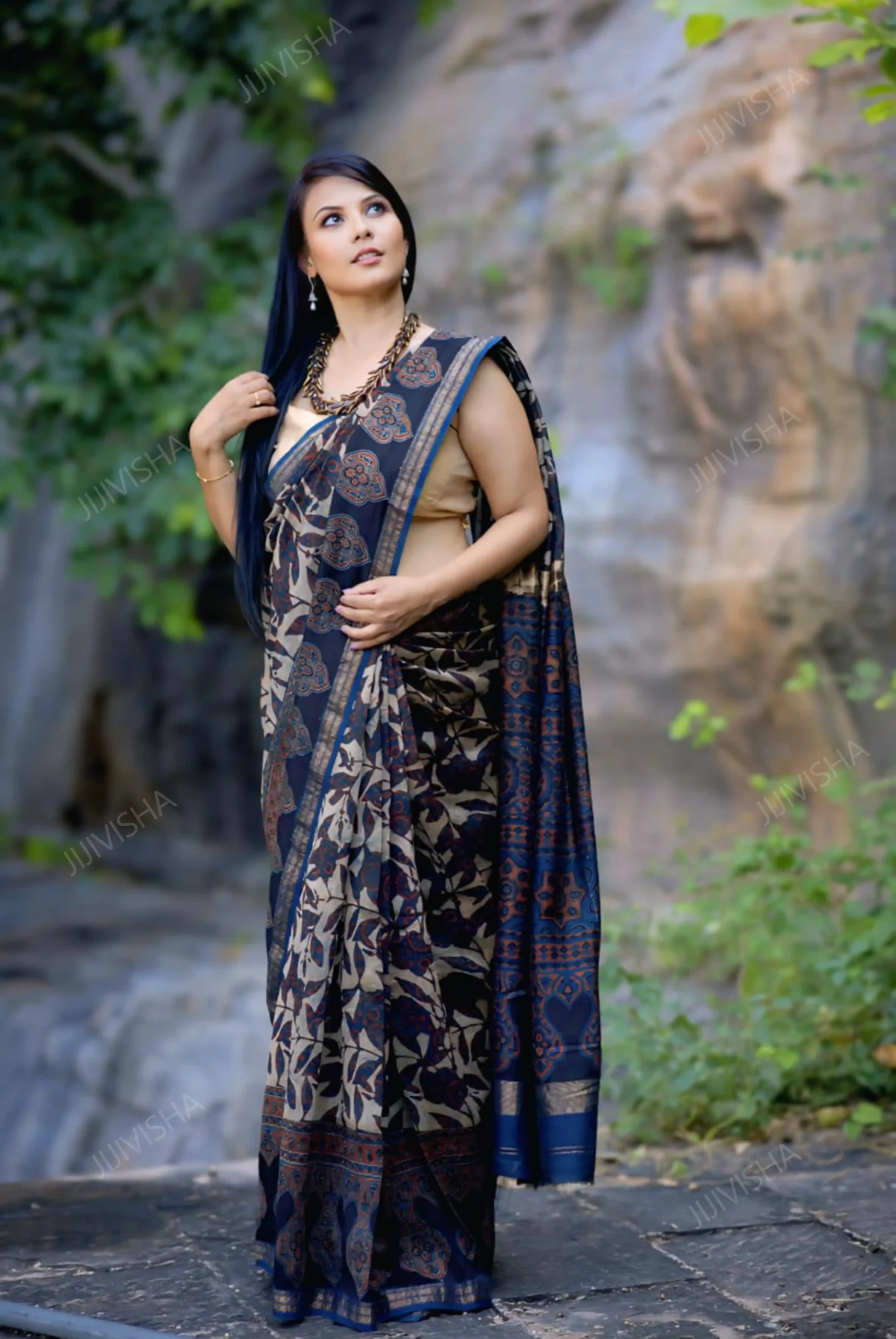 - Introducing our exquisite Maheshwari Silk Saree In Ajrakh , a timeless piece of artistry that seamlessly blends the elegance of Maheshwari silk with the intricate beauty of Ajrakh hand block printing. Crafted with skill and dedication by the esteemed artisans of Akhrakhpur, this saree is a celebration of traditional craftsmanship and heritage.
