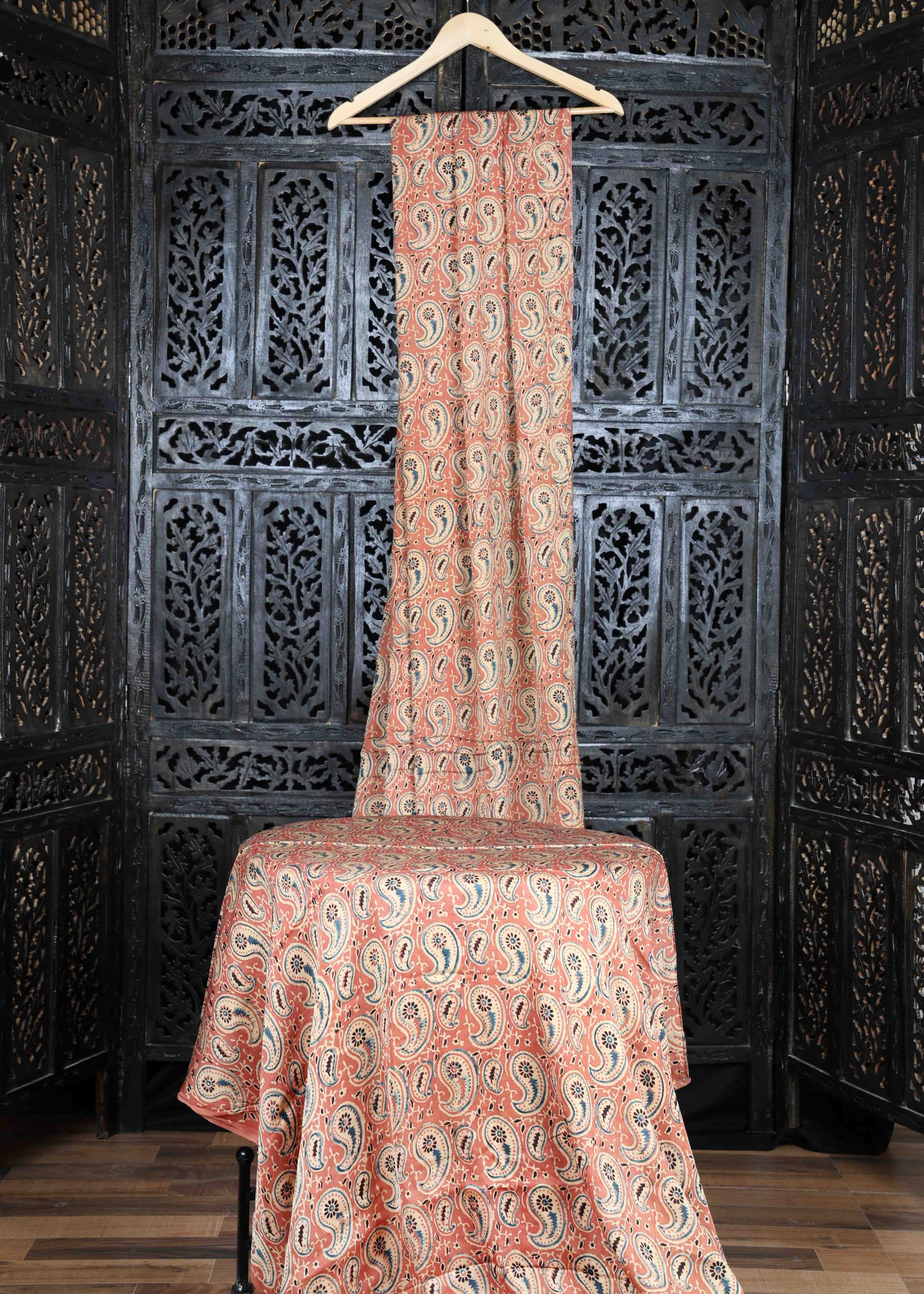 - Coral Blossom Modal Silk Kalka Ajrakh Hand Block Printed Fabric using natural dyes is an exquisite blend of modal and silk, renowned for its luxurious texture, vibrant coral red hue, and traditional Kalka print design. Modal is a type of rayon fabric made from beech tree fibers, known for its softness, breathability, and resistance to shrinking or fading. Silk, on the other hand, adds a touch of elegance and luster to the fabric, enhancing its overall appeal and drape.