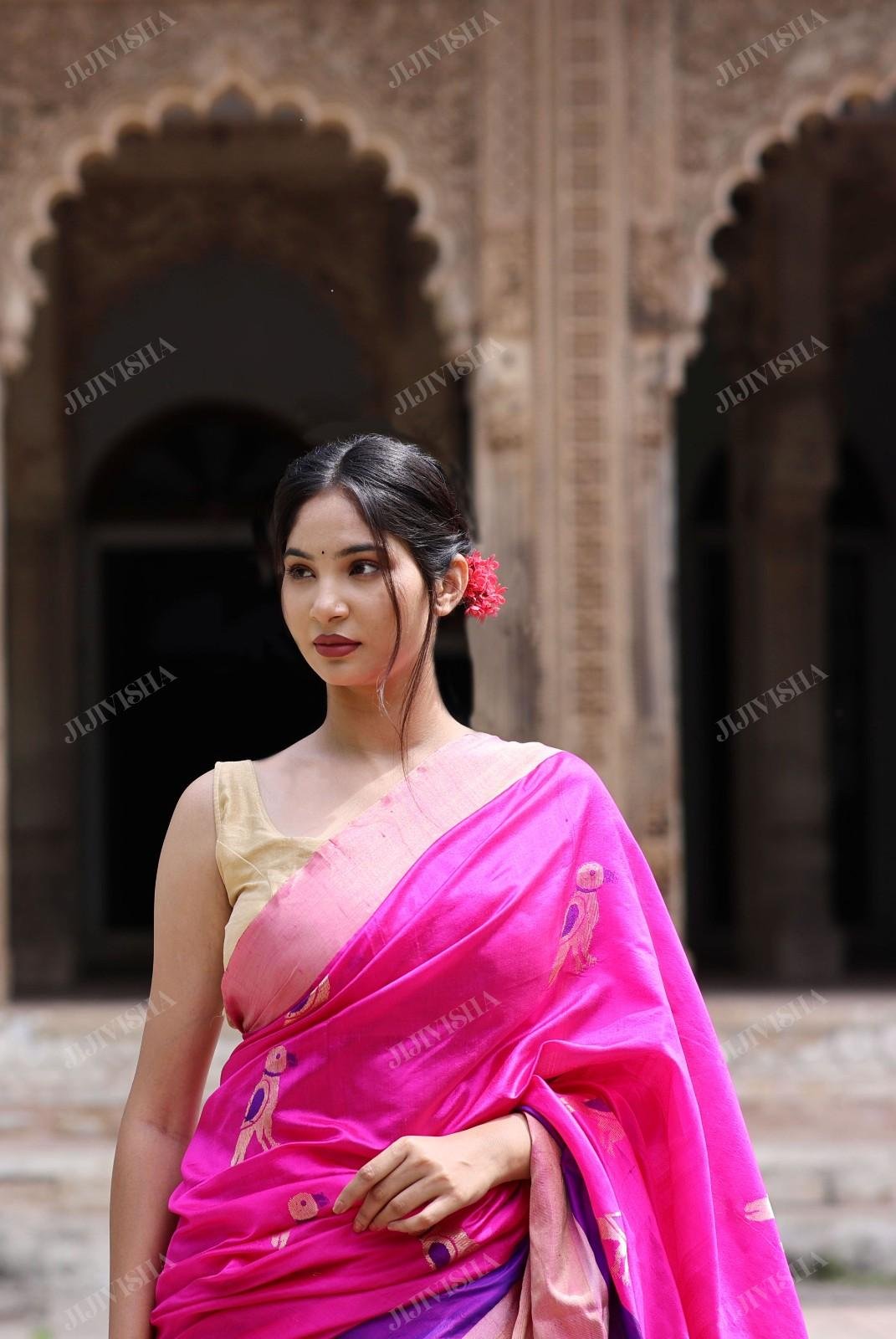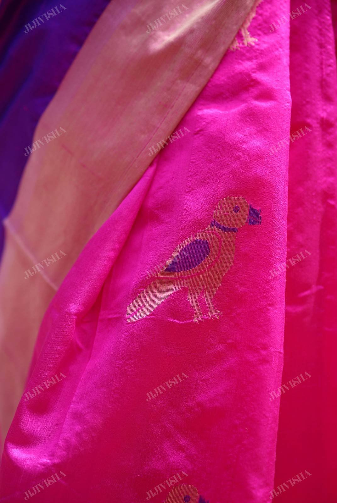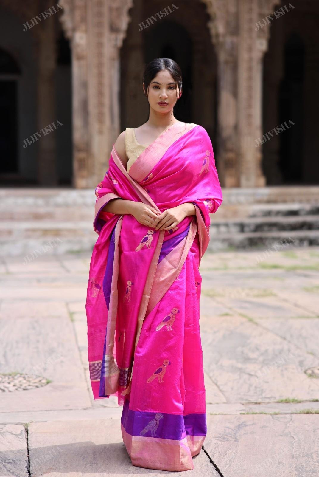 Embrace timeless beauty with this Dark Pink Chanderi Pattu Silk Hand Woven Saree with Dual Borders in Purple Golden, where vibrant purple and golden dual borders converge in a mesmerizing symphony of color and light. The saree is adorned with delicate sparrow motifs in shimmering gold and purple, creating a perfect blend of tradition and grace. Handwoven with precision, it effortlessly drapes over you, offering both comfort and elegance. Buy now this saree online at Jijivisha, India, to elevate your presence with its rich colors and artistic details in social gatherings.