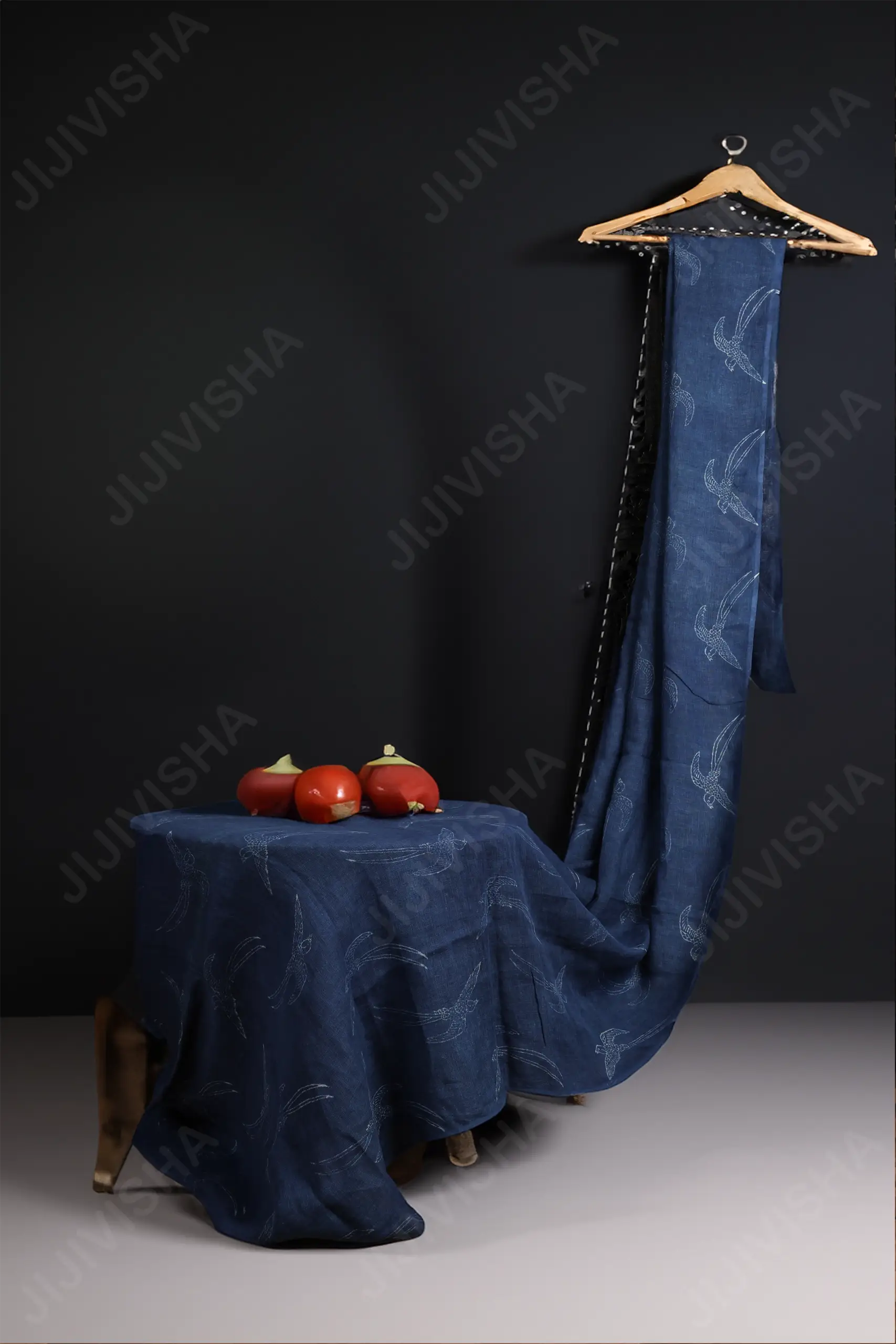 - The indigo linen provides a luxurious canvas for the intricate avian motifs, capturing the essence of Indian wildlife in every detail. The black drongo birds, known for their grace and beauty, dance across the fabric, creating a visually captivating narrative inspired by the country's rich biodiversity.