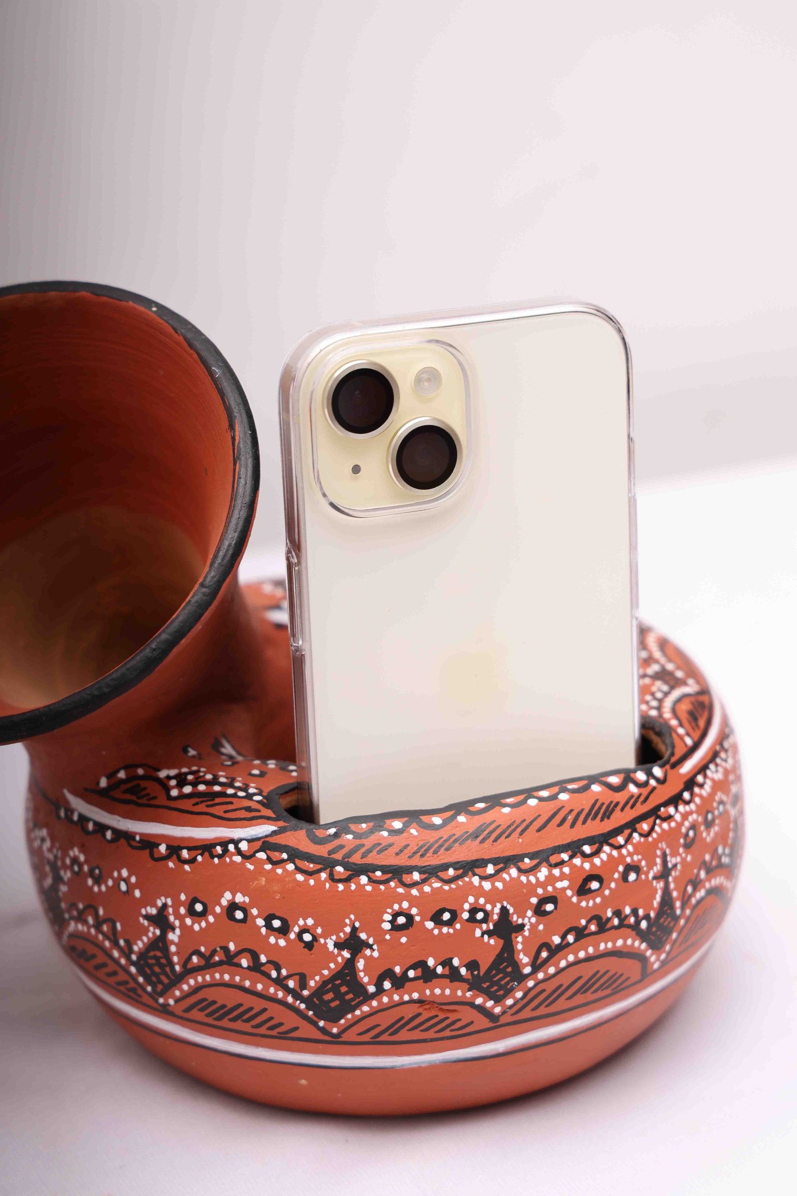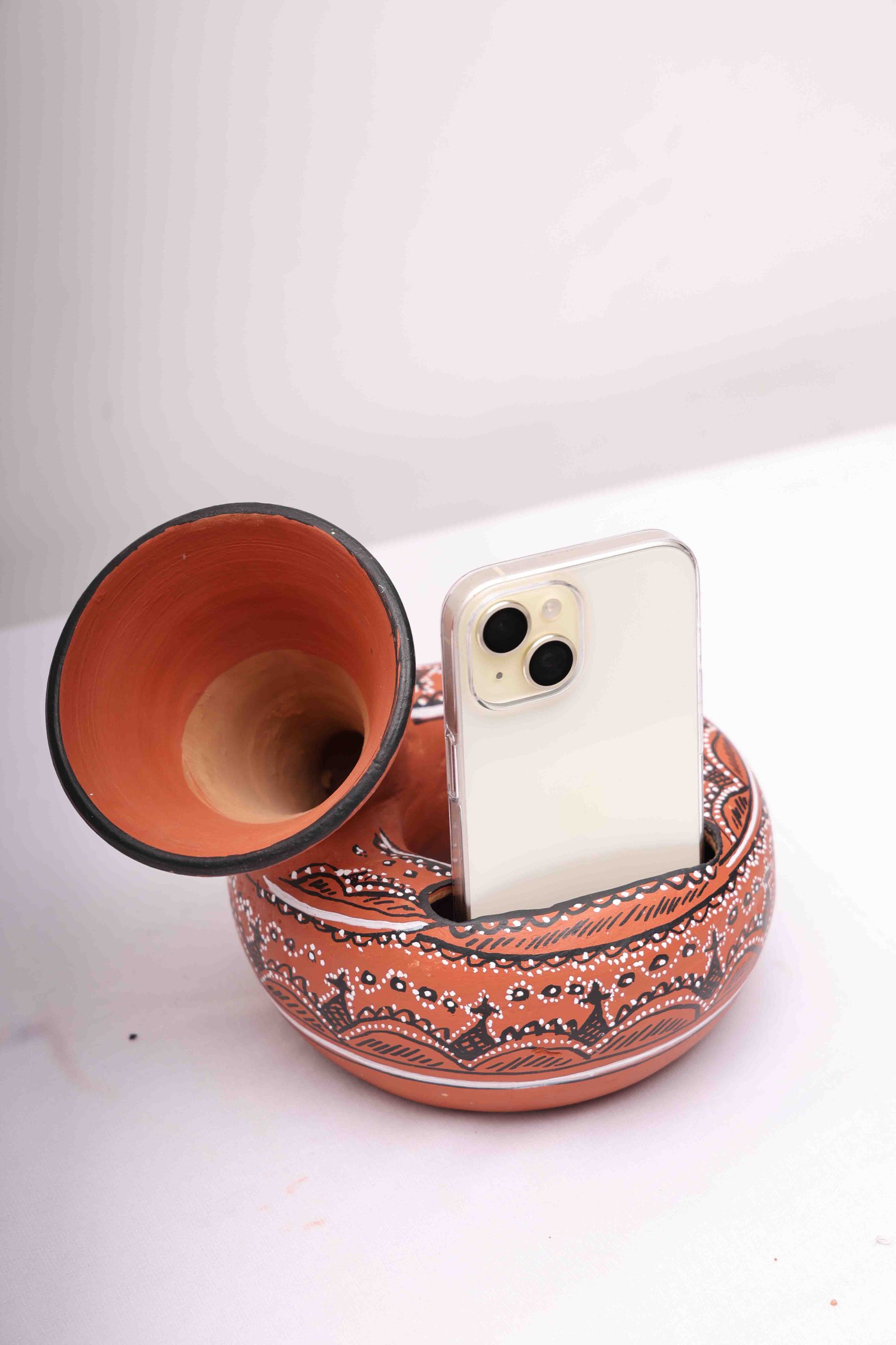 Combine technology and tradition with our Terracotta Phone Amplifier, a natural speaker crafted in India! This beautifully hand-painted clay phone amplifier combines contemporary audio design with classic Indian pottery. It is made entirely from eco-friendly clay. It uses just natural, earthy dynamics to naturally amplify the sound from your smartphone without the need for energy, wires, or Bluetooth.