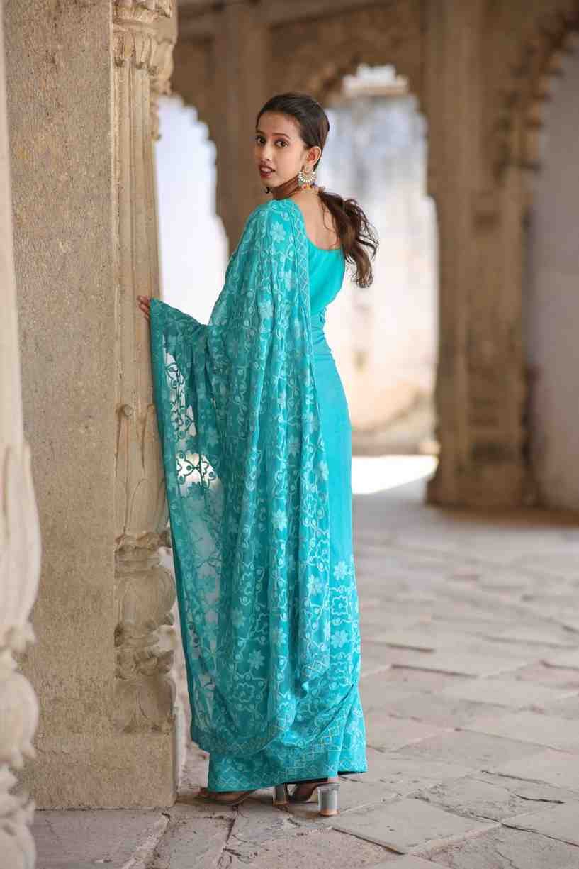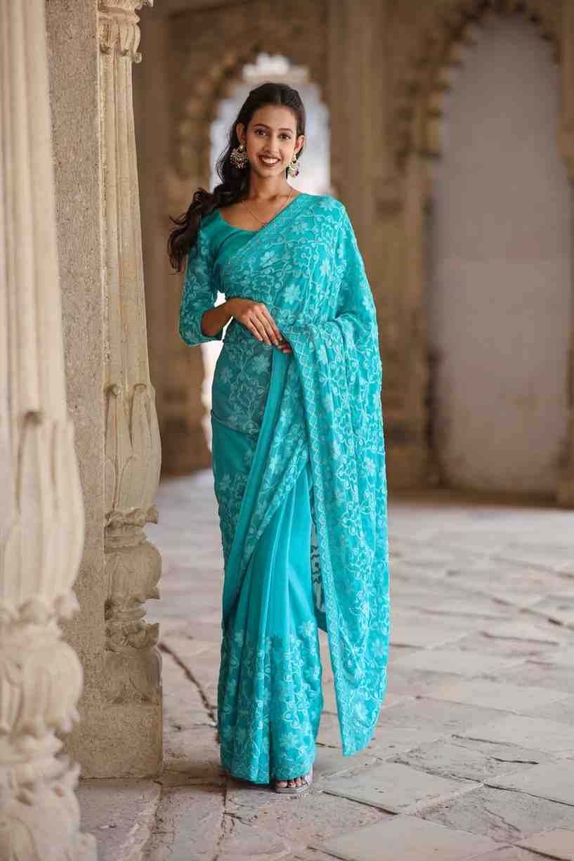 - This saree exudes timeless charm, making it an ideal choice for any special occasion or festival celebration where you want to look your absolute best. Carrying this sea green georgette saree with hand embroidery is not just a fashion statement; it’s an expression of elegance, style, and sophistication. Elevate your special occasions and festival celebrations with our Georgette Saree with Hand Embroidery and Pre-Stitched Blouse.