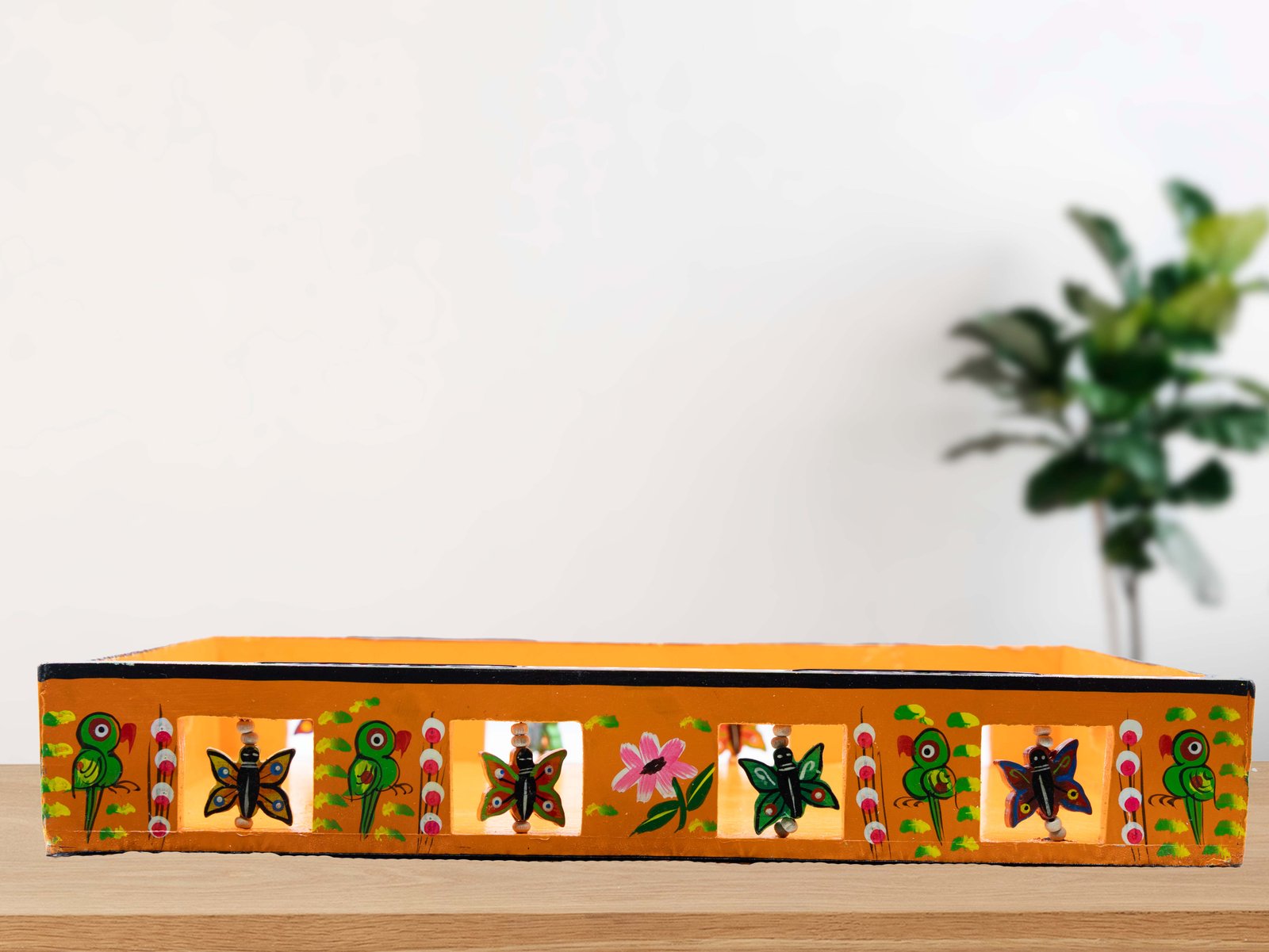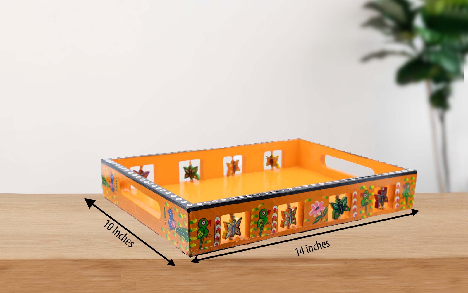 Impress your guests with a touch of class in your serving experience using our lovely, hand-painted wooden serving tray. This tray is a work of art. It is hand-painted by skilled artists. This tray is a great addition to your home decor or gift to loved ones because it is both useful and beautiful. The bird and butterfly decor are tastefully set against the vibrant orange color, so this is a striking piece. This hand-painted tray will bring a touch of elegance and whimsy to any space, whether you’re having breakfast in bed, having a tea party, or just leaving it out as decor.