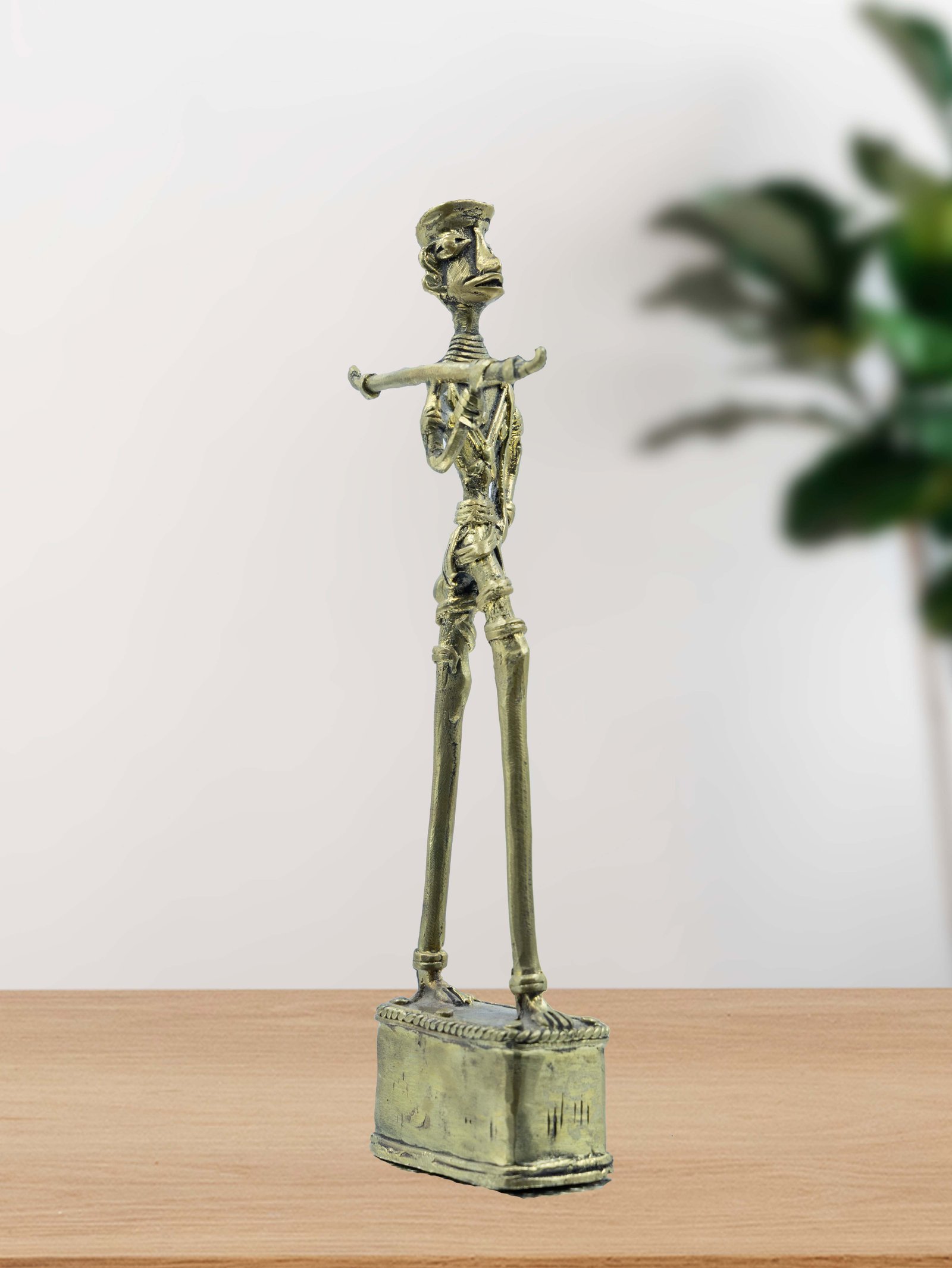 Add a touch of tradition to your home with our Dokra handmade pure solid brass showpiece! This exquisite showpiece was created by expert artisans from West Bengal utilizing the ancient Dokra technique. Each piece is unique and carefully crafted, making it an ideal addition to your home decor collection. This showpiece includes a unique, handcrafted brass sculpture of an elongated, thin figure. The figure wears traditional clothing with subtle details and is standing upright on a miniature rectangular base. The stance of the figure provides a sense of sophistication and purpose, and the figure is holding something or an instrument in one hand. Despite the fact that it maintains a gesture toward traditional work, the abstract details and elongated legs of the statue provide a sense of modern, progressive surroundings. The work is a Dokra handicraft characterized by its unique and intricate nature.