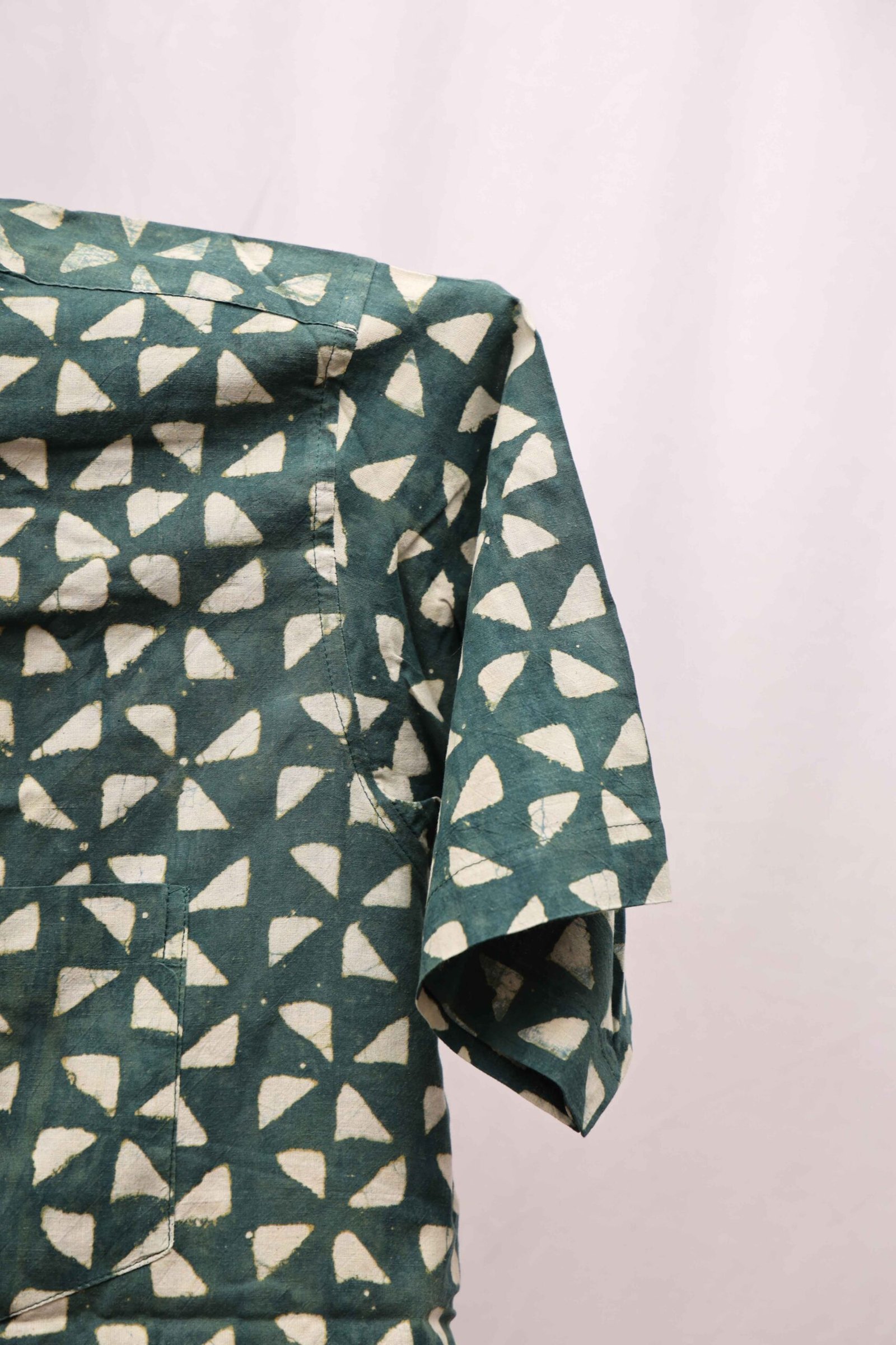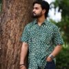 This Green cotton shirt features an elegant black floral handblock print,blending traditional artistry with modern style. Crafted from soft breathable cotton, it ensures comfort through out the day while maintaining a refined appearance. The handblock printing technique,done by skilled artisans,adds a unique handcrafted charm to each piece ,making every shirt slightly different and truly special. The monocrome floral pattern stands out beautifully against the Green background,offering a timeless appeal suitable for both casual and semiformal occasions.Pair it with trousers,skirts,or jeans for a versatile look that reflects effortless grace and a touch of artisanal heritage.