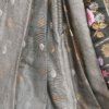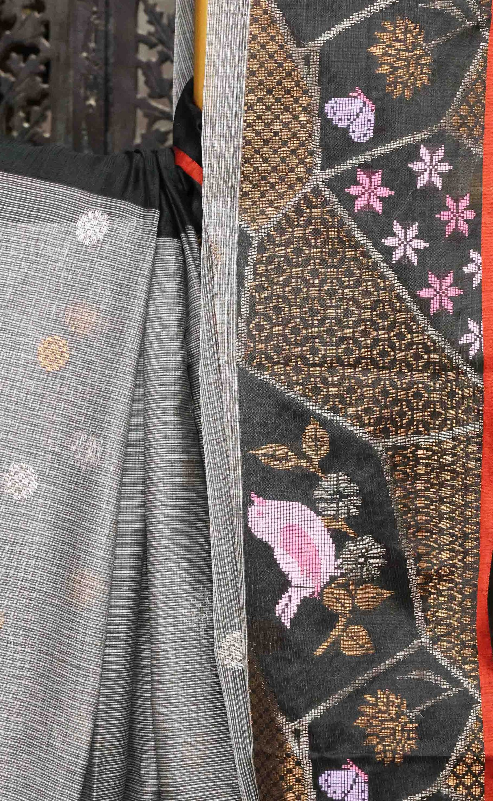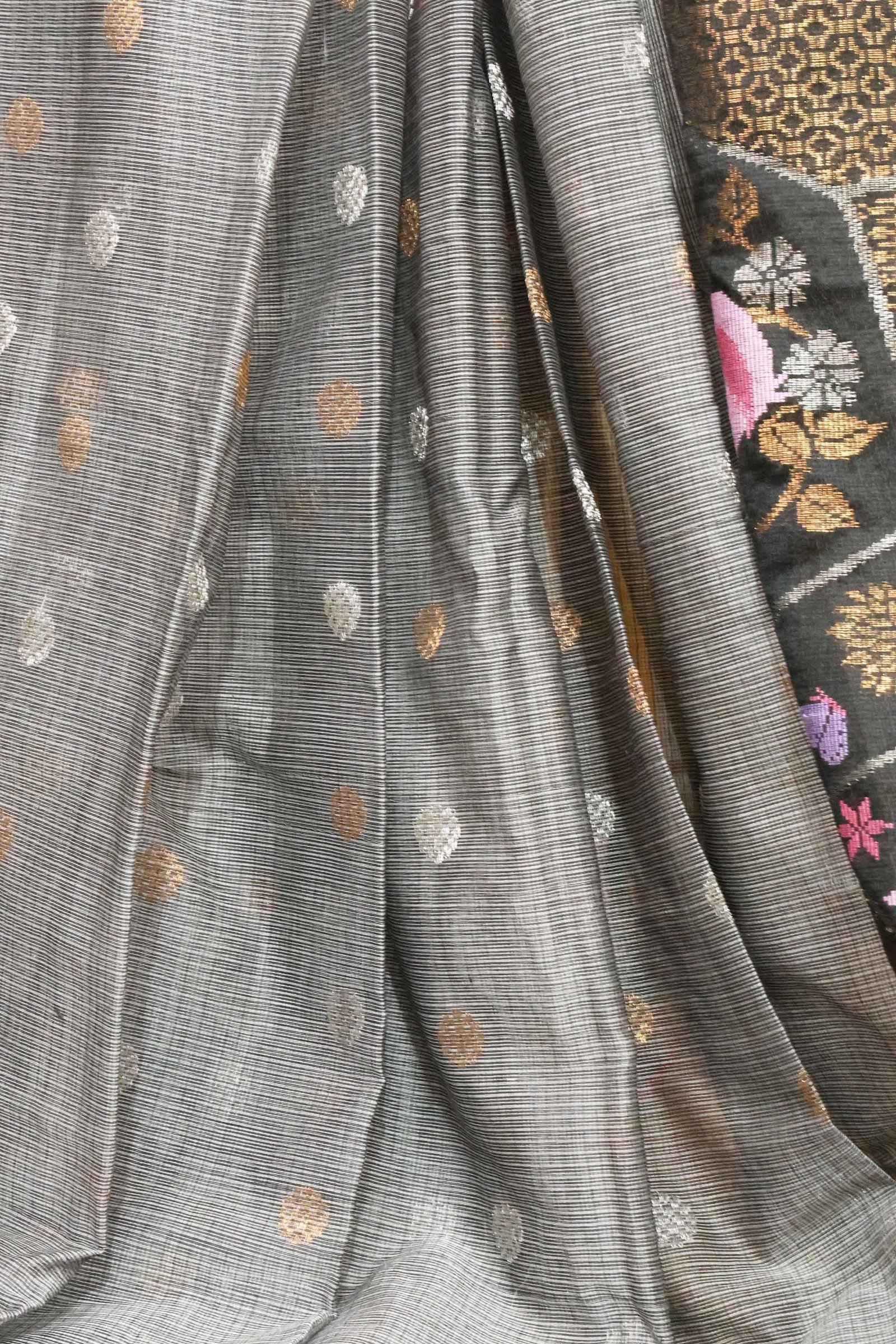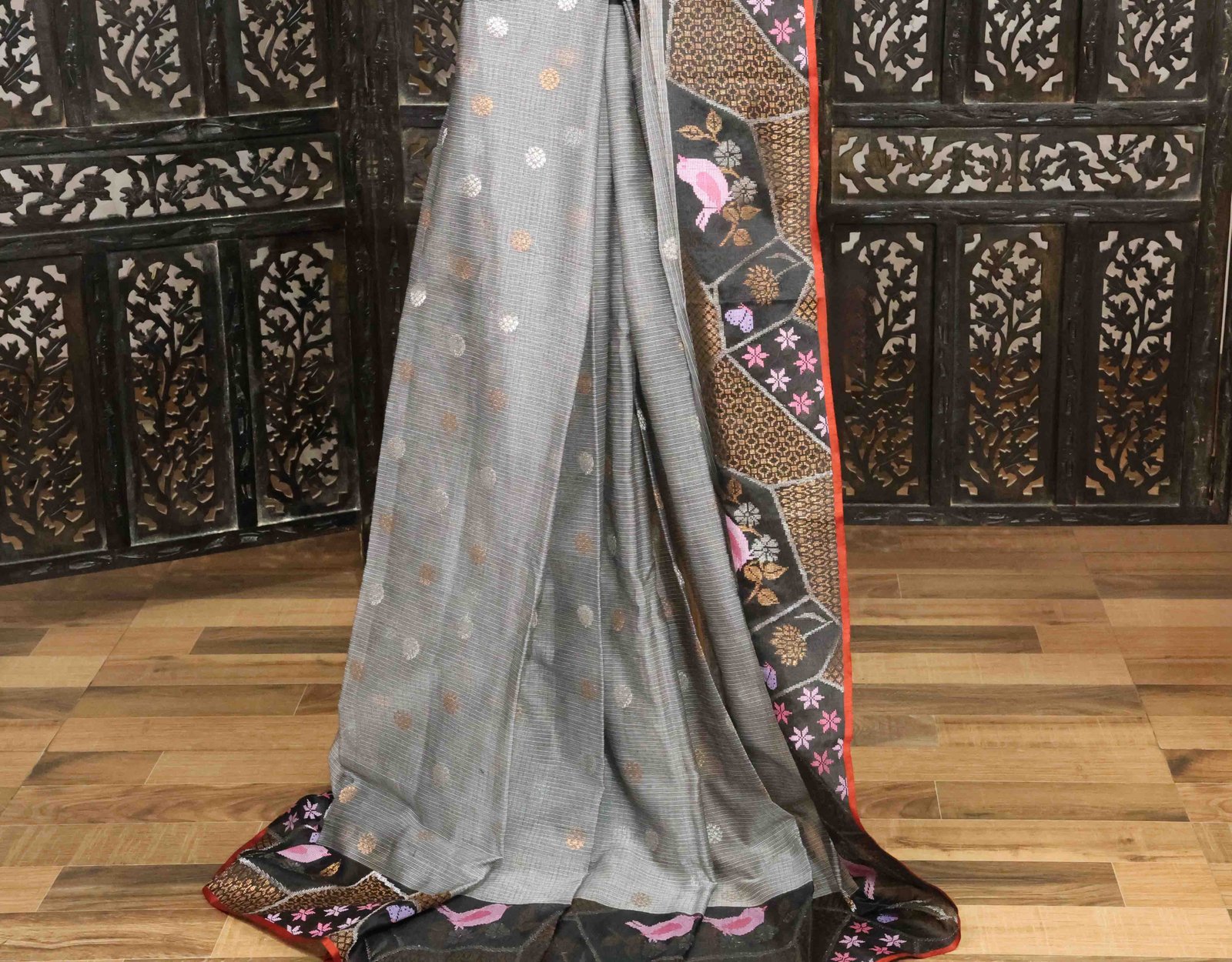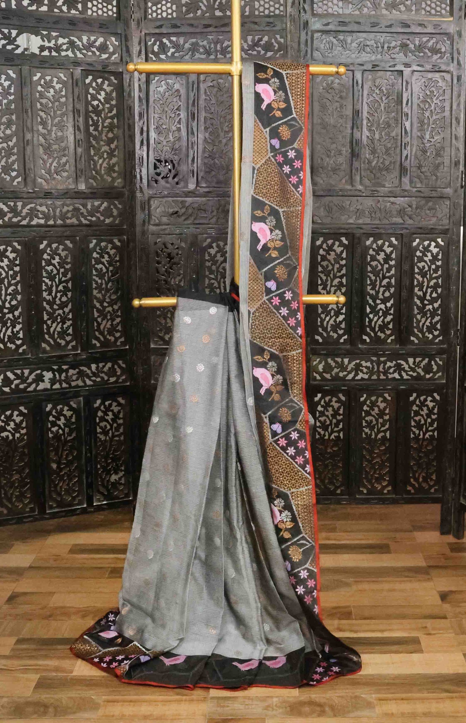 The Jijivisha Collection presents a stunning handwoven saree in a sophisticated grey color, crafted with real gold and silver zari. The saree is adorned with delicate golden and silver butti motifs that span across the entire fabric, adding a rich texture and timeless charm. The intricate black border features beautiful bird and geometric patterns, enhancing the overall design with a modern yet traditional touch. Accompanied by a matching black blouse, the blouse is embellished with complementary gold and silver motifs, creating a harmonious and elegant look. This exquisite saree comes with GI (Geographical Indication) tags and a certificate, ensuring its authenticity and superior craftsmanship. Ideal for weddings, formal events, or cultural celebrations, this saree exudes luxury, grace, and meticulous artistry, making it a perfect choice for those seeking something truly special.