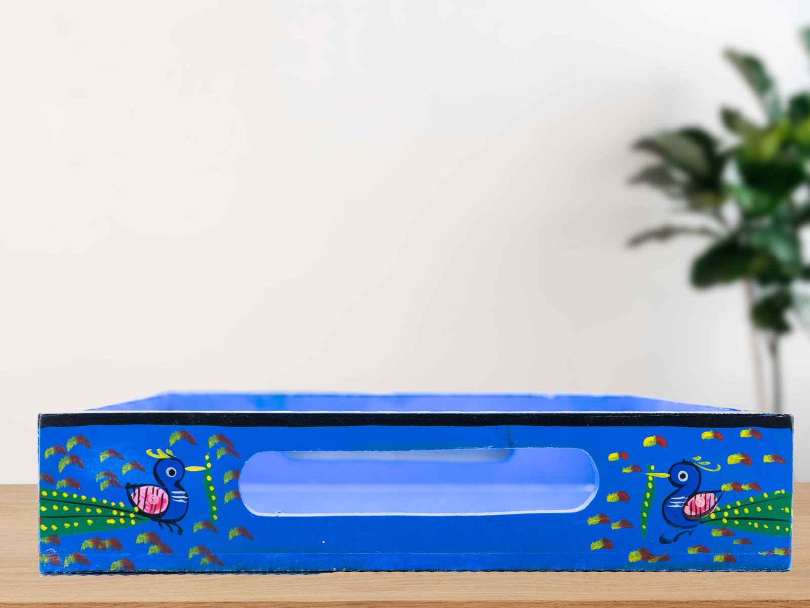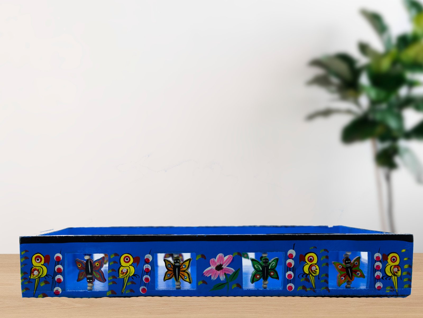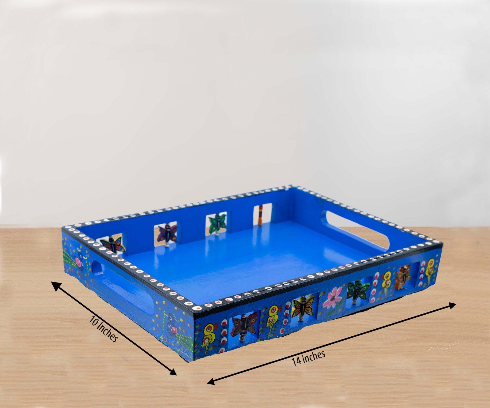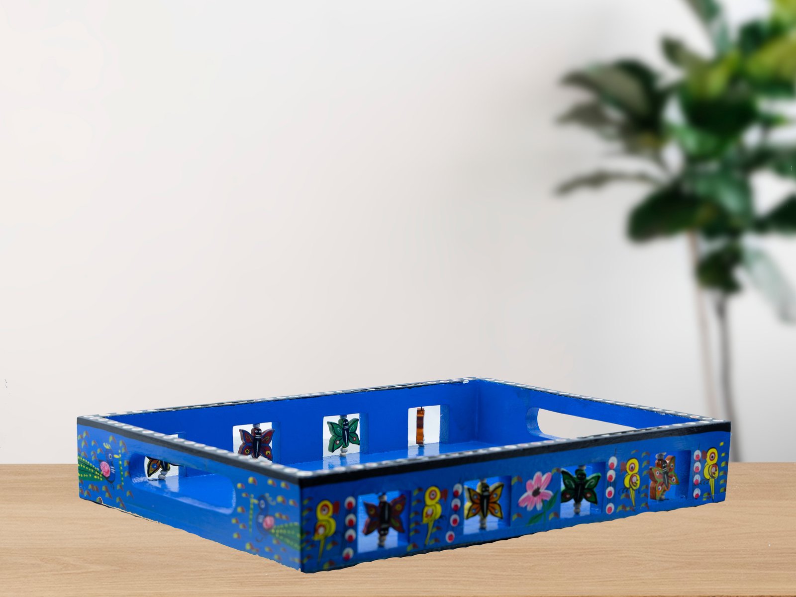 This tray has a lovely blue color, with birds, butterflies, peacocks, and delicate floral motifs. The butterfly designs in the square cutouts on the edges add a beautiful and soothing touch to the design.