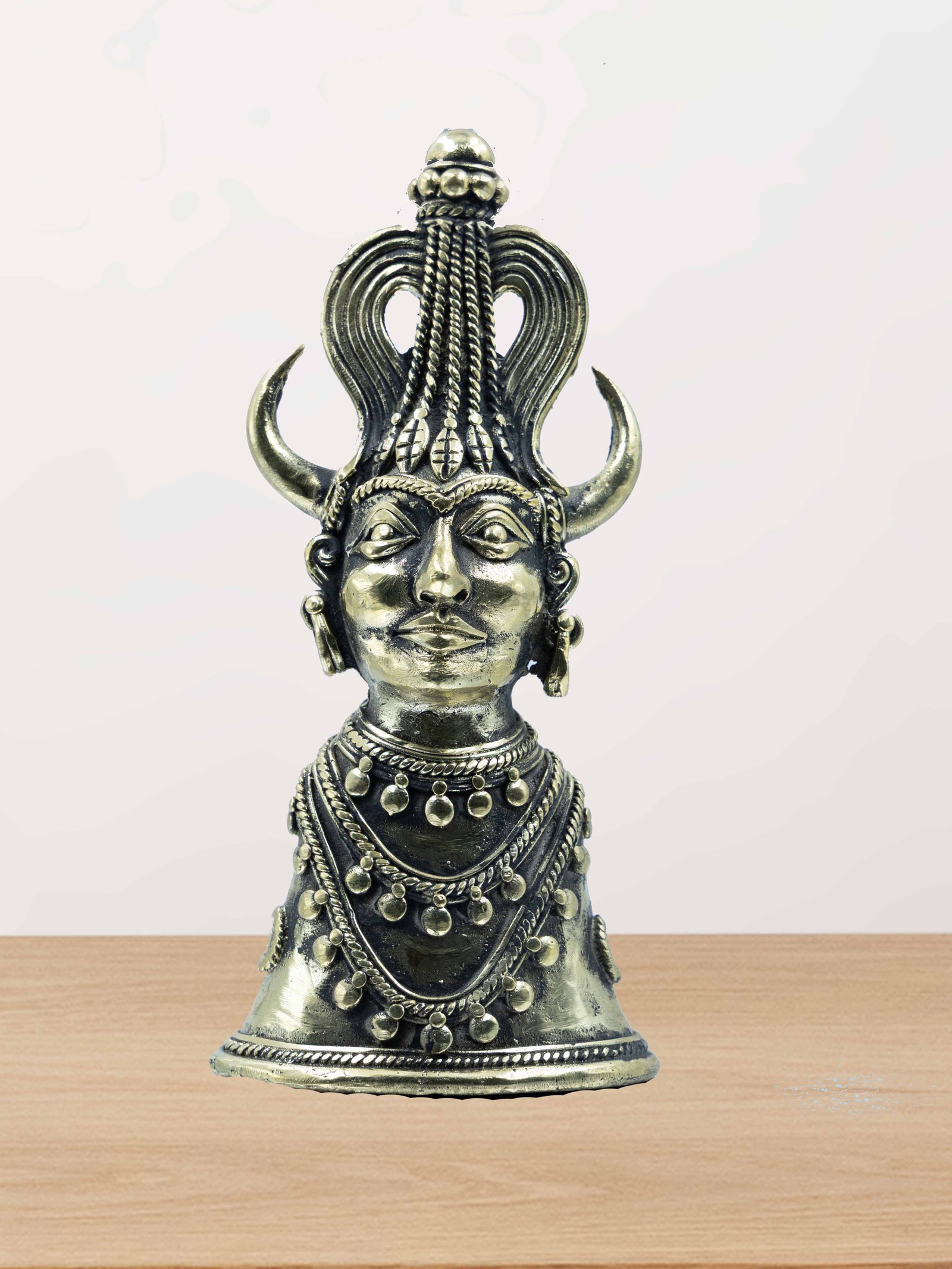 Give a touch of antique elegance to your home with our beautiful handcrafted Dokra art brass tribal queen and king figurine! Rich with detailed aspects and having a rough finish enhancing their handcrafted looks, the figurines outline the majestic charm of a tribal king and queen. The king and queen, both with individual distinctive different crowns and enriched with beautiful tribal jewelry, look exceptionally beautiful with this half-body showcase piece. They are ideal for art aficionados, art collectors, and anyone who wants to add ethnic grace and elegance to their environment.