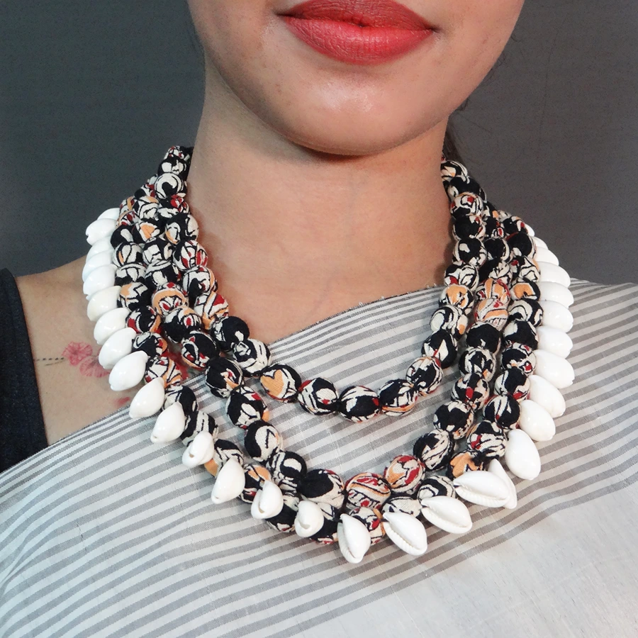 - Make a vibrant statement with this handcrafted Kodi necklace. Colourful fabric balls encircle the neck, each one lovingly knotted by hand. A sea shell dangles from the outer fabric at every knot, catching the light with its natural iridescence.