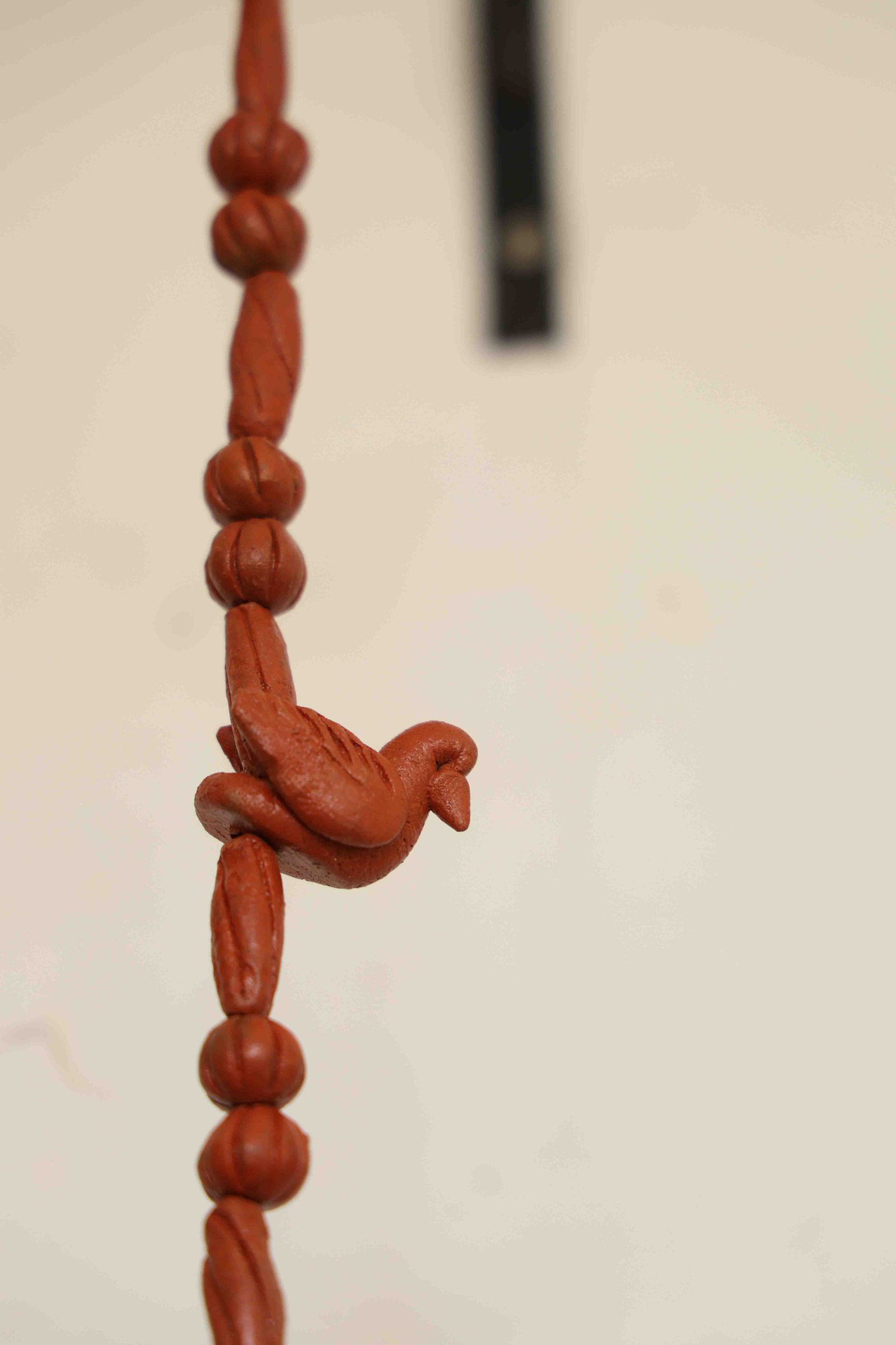 It’s hanging from a vertical string of terracotta beads, which are gently mixed with artistically sculpted birds. Skilled artists individually hand-model each bird and bead. These handcrafted bells have a circular head with symmetrical cutouts and etchings, and it is adorned with exquisite carved details. The hanging loop at the top enables easy installation in balconies, entrance ways, patios, gardens, or even indoor corners to add a peaceful, natural touch.