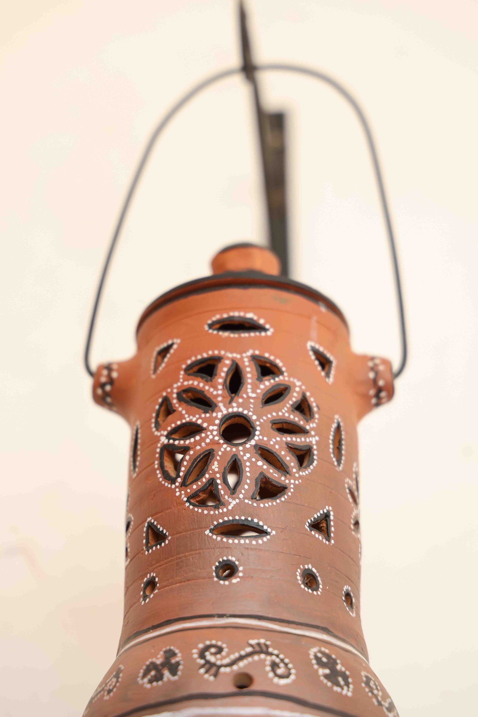 The design of the lamp is taken from traditional lanterns but with detailed patterns and a natural clay finish that adds more beauty and a rural charm to wherever it is placed. The clay lamp is not only fancy because of the detailed design but also because of the hard wrought iron rod from which it is suspended. The black powder-coated bar goes well with the lamp’s natural colors.