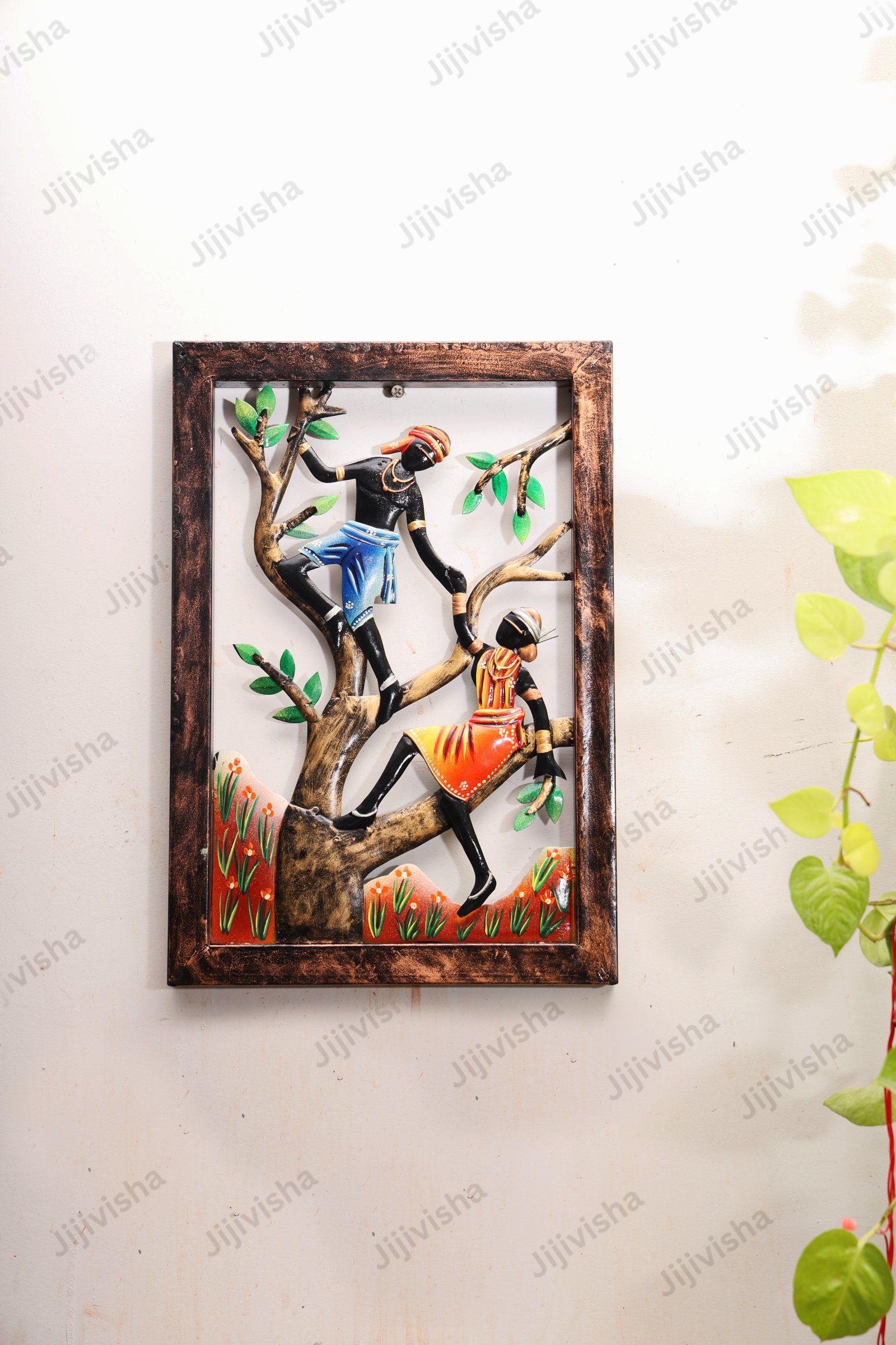 Embrace the essence of tribal art with our exquisitely crafted wall art frame, which showcases a vibrant and symbolic tribal design. Two tribal figures—one male and one female—are depicted climbing a tree in the artwork. The figures are dressed in vibrant traditional attire, with the male donning a blue skirt and the female in a bright red-orange dress. Both characters are presented in dynamic, graceful poses as if they are climbing gracefully or playfully. A rustic brown frame covers the complete piece, which contributes to its handcrafted and ethnic appeal.