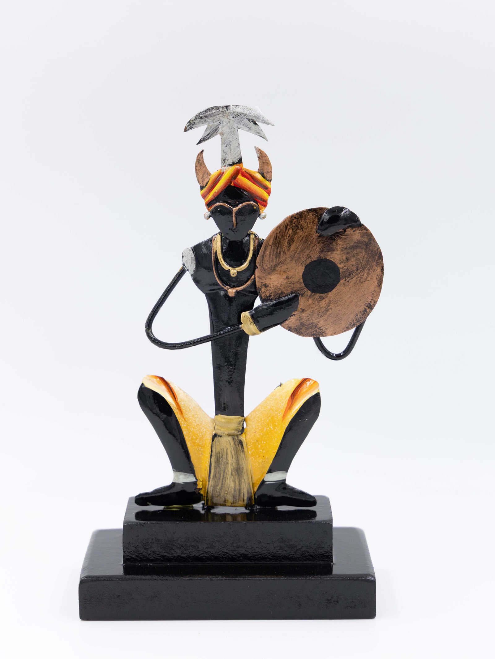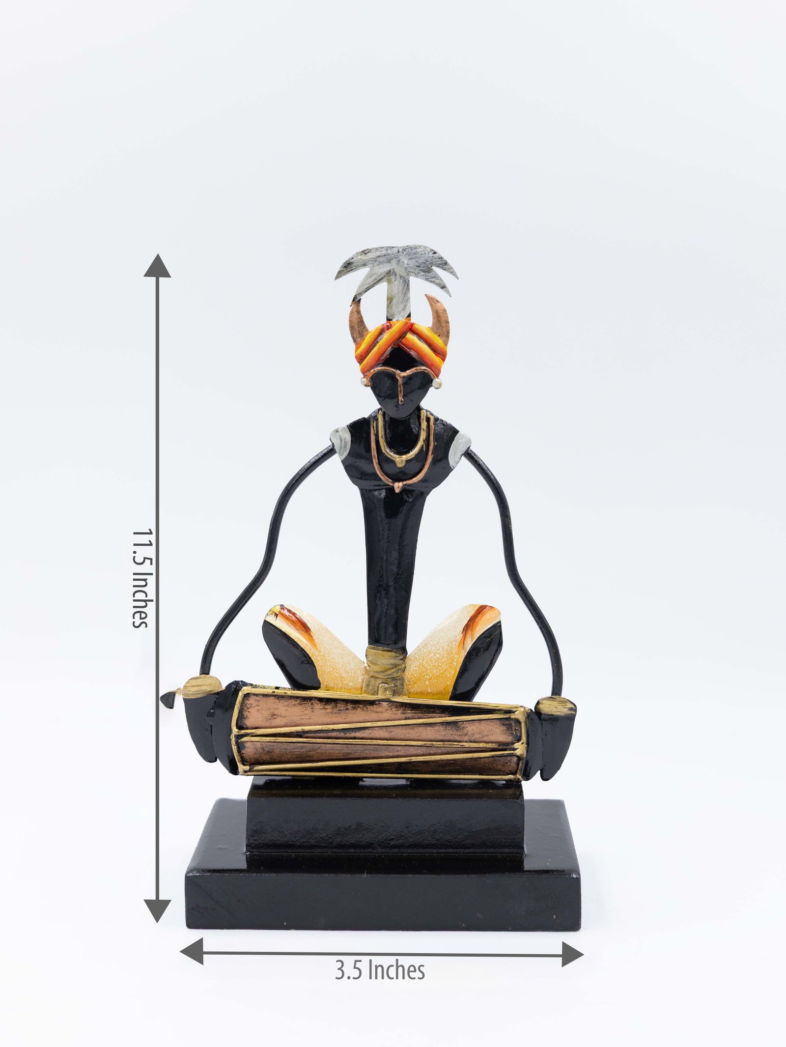 Bring the rhythm of tradition home with our hand-painted tribal musician’s decorative set of 3! It consists of three separate decorative figures presented upon a tribal design. Each figure depicts a tribal musician playing a different traditional instrument. The left man depicts a sitting tribal figure playing a dholak (a sort of drum). The figure is made of wrought iron and painted in brilliant colors, including orange, black, yellow, and silver. The center man plays a large handheld Dafli while seated in a dynamic position, displaying a vivid musical motion. The metallic textures and precise artistry focus on craftsmanship. The right man is sitting and holding a circle drum in front of him. Headgear and posture are identical to the other two, providing visual continuity to the set.