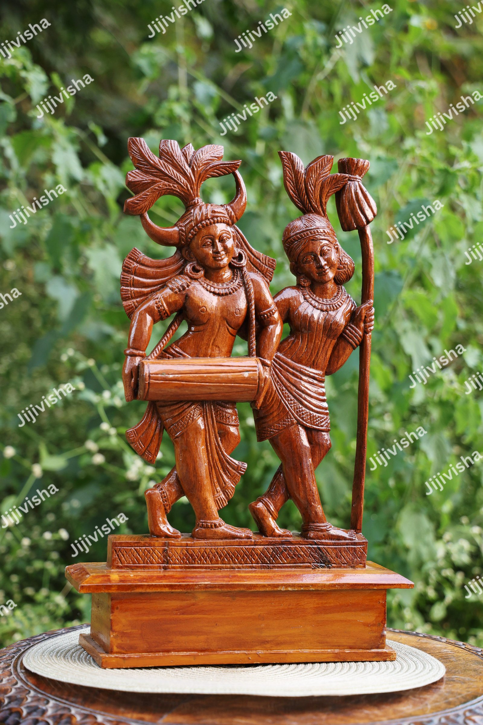 Bring the essence of tribal life into your home decor with our beautiful wooden tribal dance showpiece! The showpiece features a smiling couple dancing a traditional folk dance, symbolizing harmony, tradition, and the rhythmic tempo of rural India. It is perfect for bringing rustic, earthy beauty to your home decor or as a considerate gift for art lovers. The details are specific, ranging from the dancer’s rhythmic posture and musical instrument to the ornate headpiece and traditional clothes, all carved in rich wood tones.