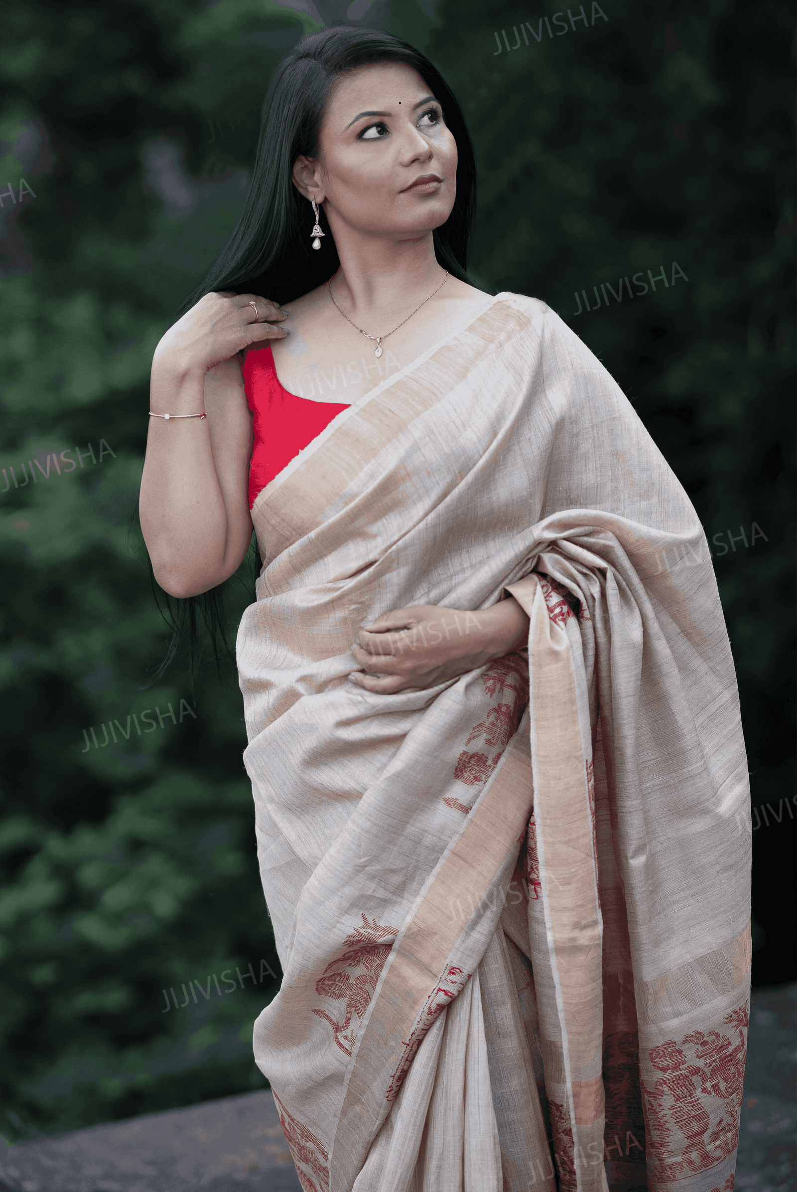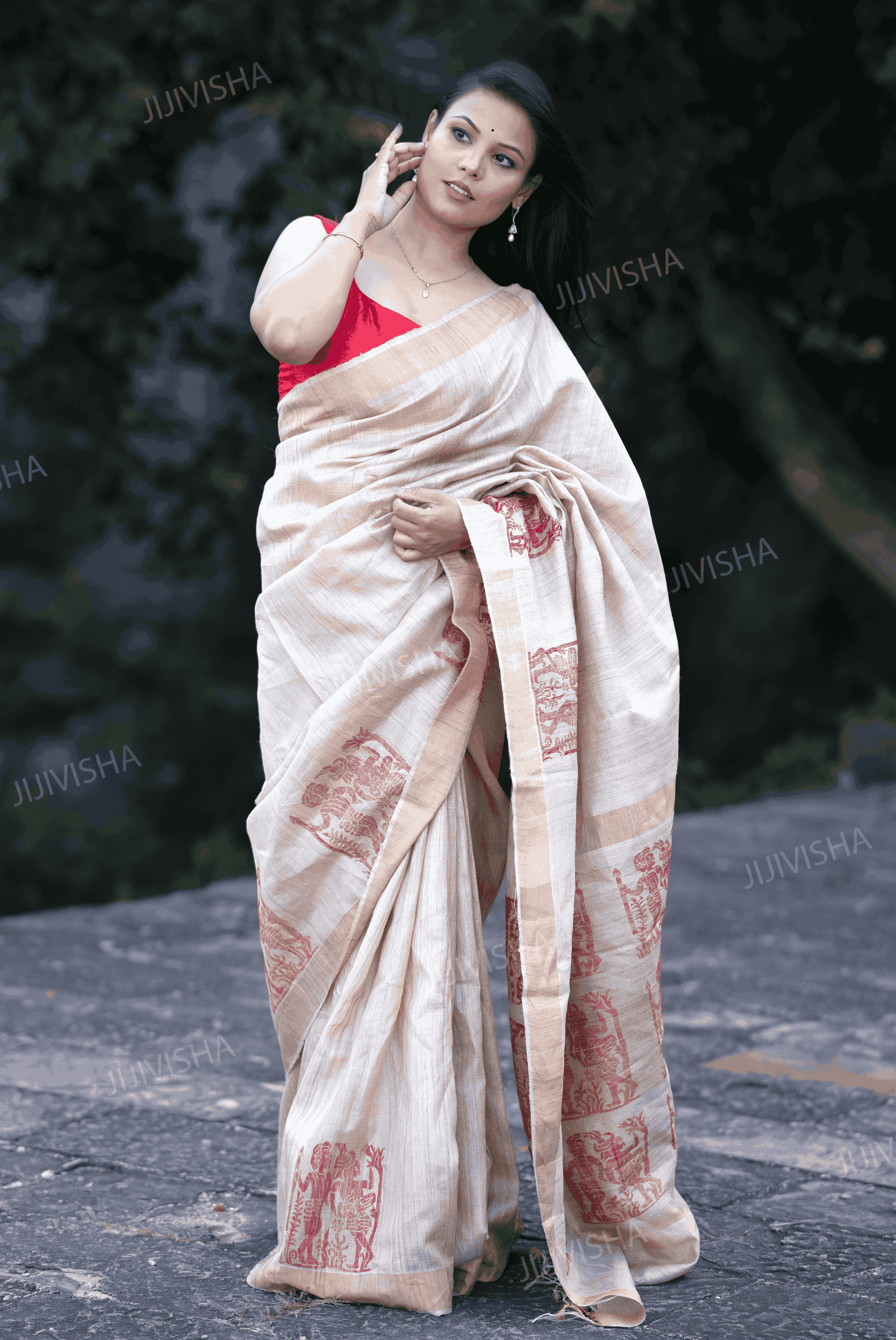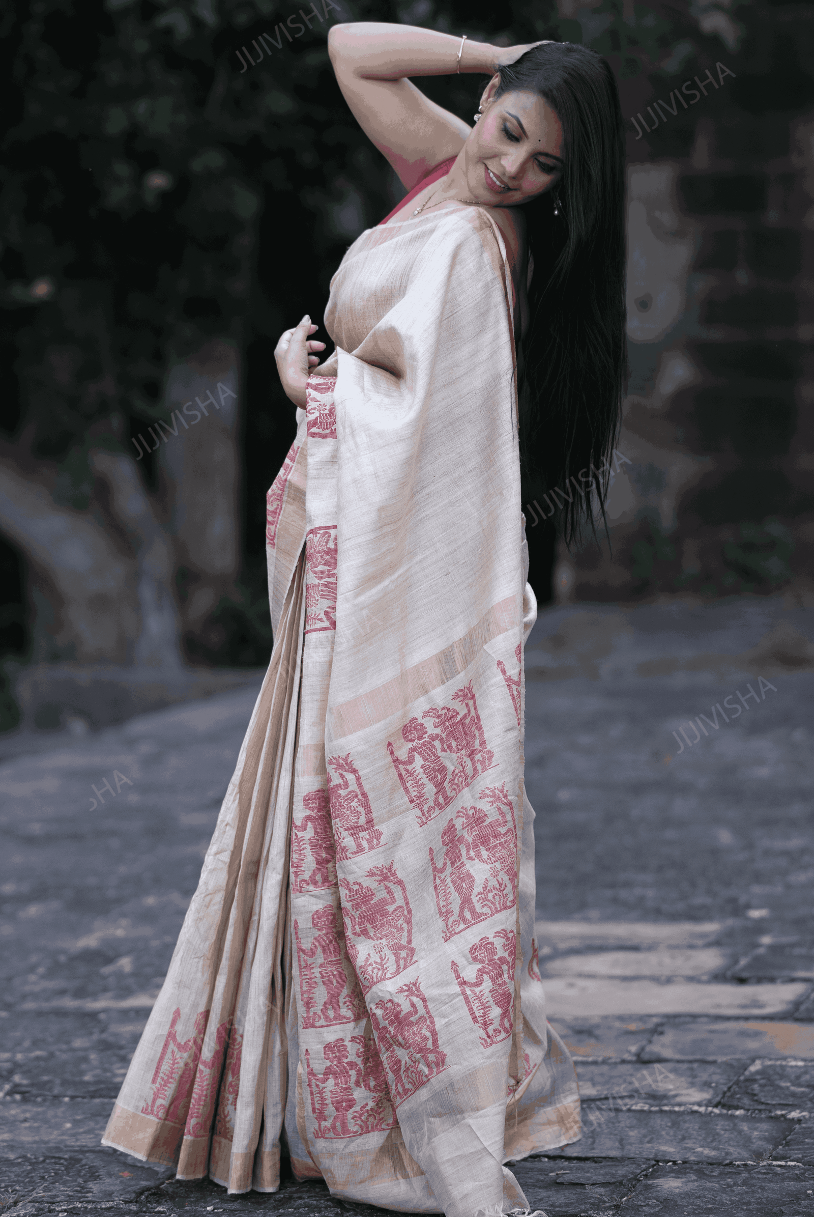 Kosa Silk Saree with Red Tribal Couple Motifs
