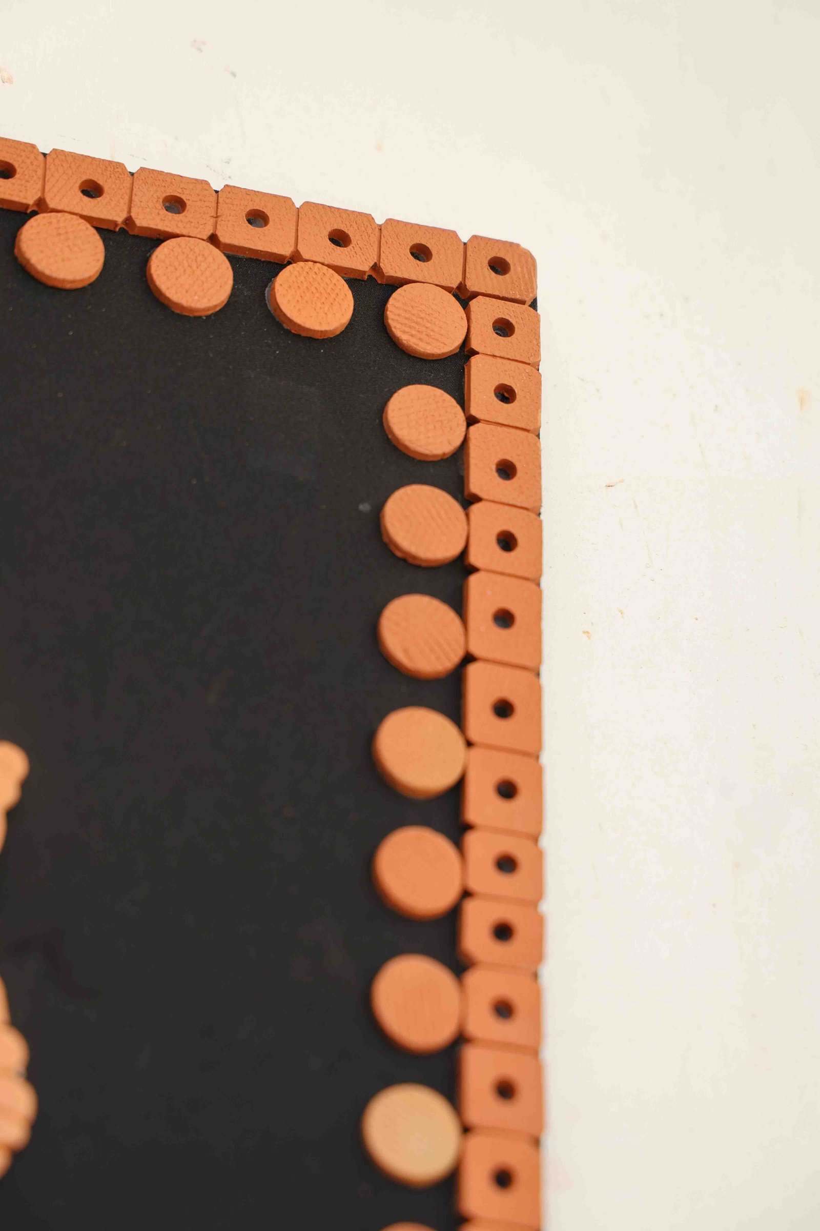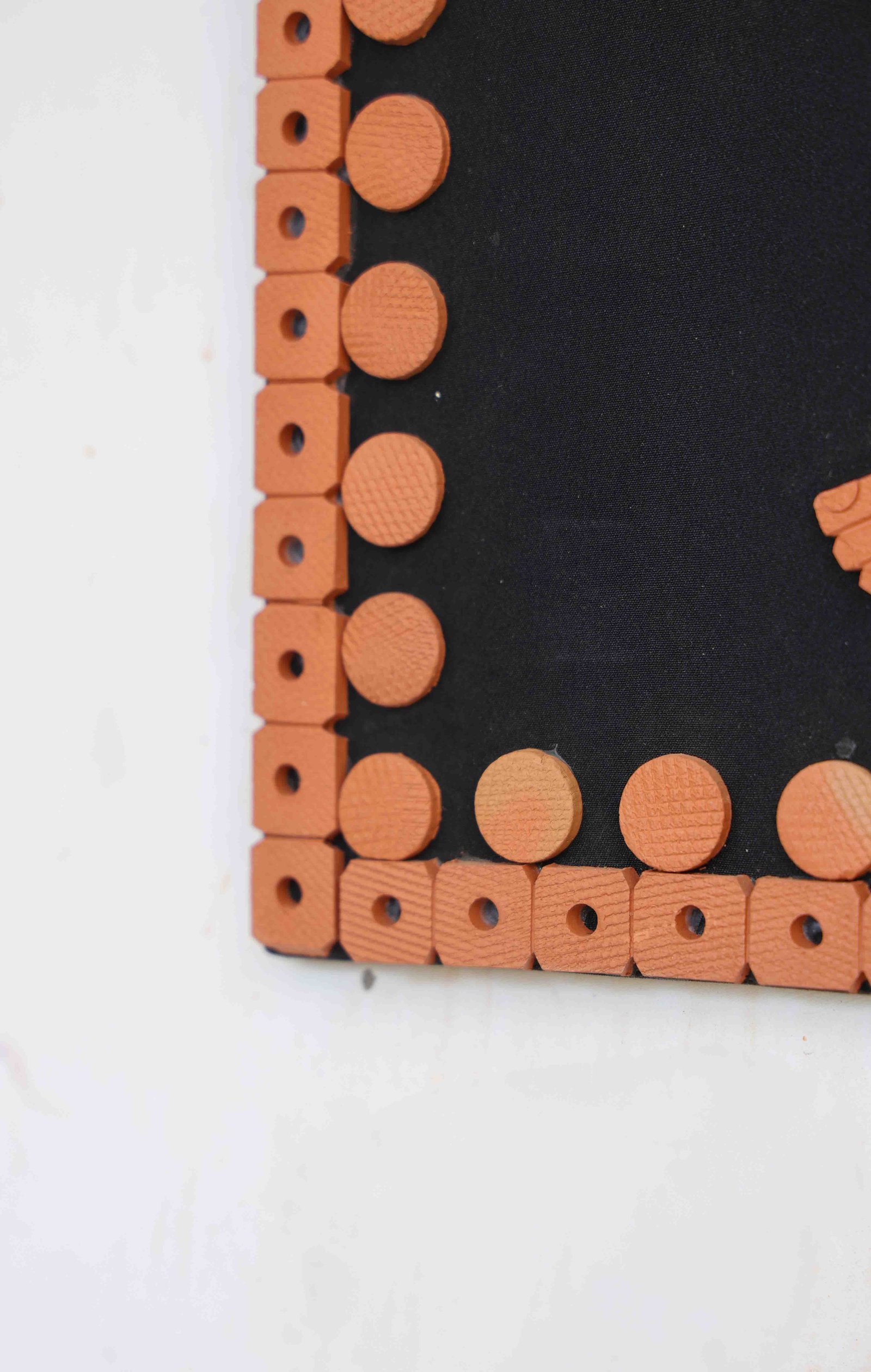 A clean, transparent black background moderates the artwork, and it will shine the terracotta’s unique exterior out. A charming design with round natural clay dots is put on the outer edges. The hot, earthy colors of the terracotta that are in contrast with the deep black cause a breathtaking visual impact.