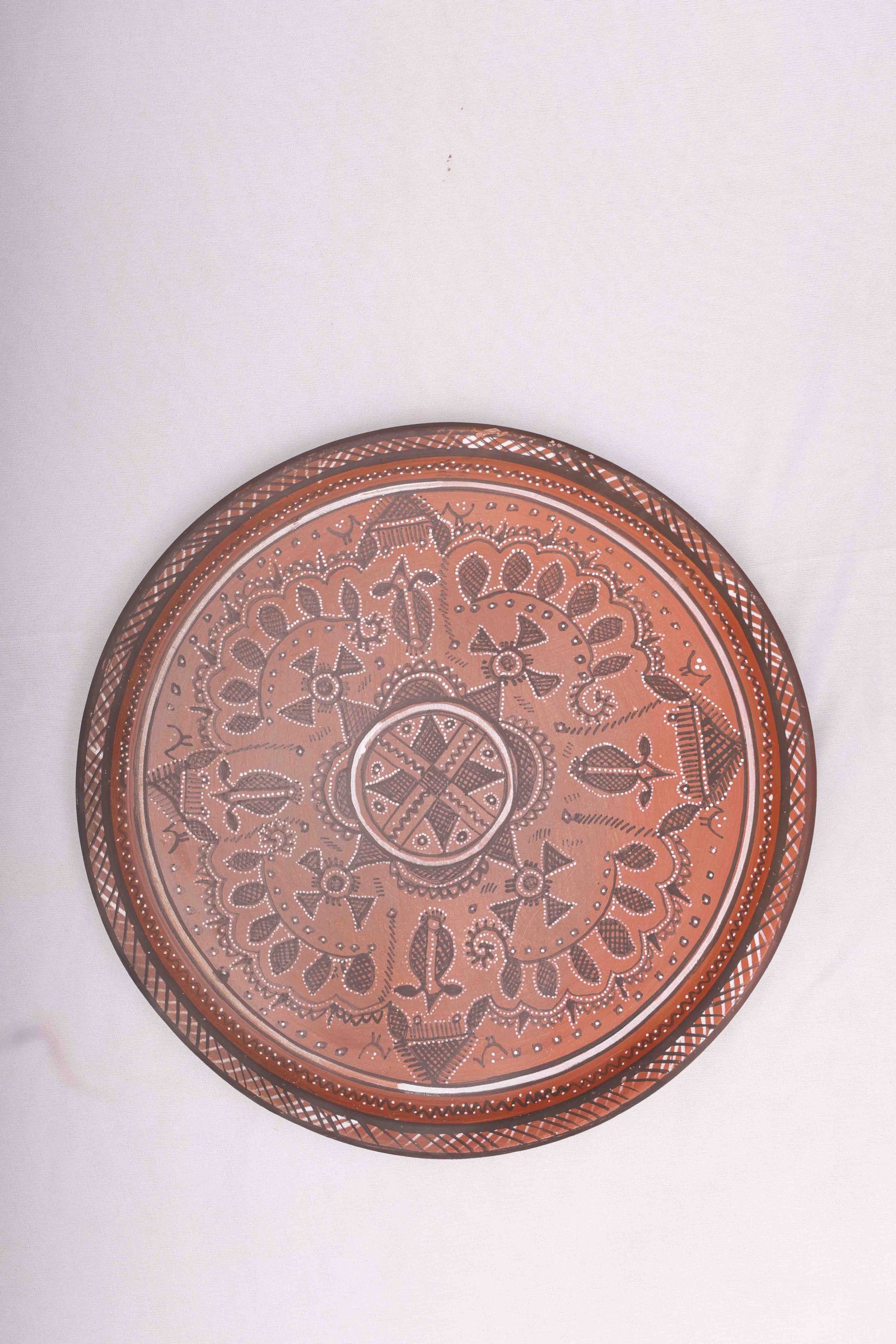 Enhance your area with the appeal of our handcrafted Terracotta plates! The terracotta plates are meticulously made of natural terracotta clay and are decorated with elaborate, hand-drawn patterns. The symmetrical mandala-type pattern which includes geometric details, tribal symbols, and elements from nature is drawn from traditional Kutch folk art.