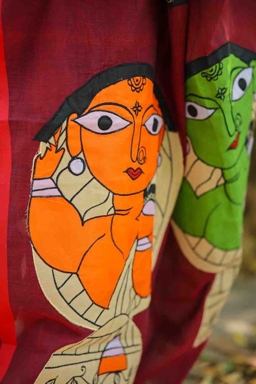 - A Maroon Cotton Saree With Applique Work saree is a type of traditional Indian garment that is made from lightweight cotton fabric and features intricate applique work. Applique is a technique of sewing small pieces of fabric onto a larger piece to create a pattern or design. Maroon Cotton Saree With Applique Work sarees feature delicate geometric patterns, and are embellished extra texture and sparkle.