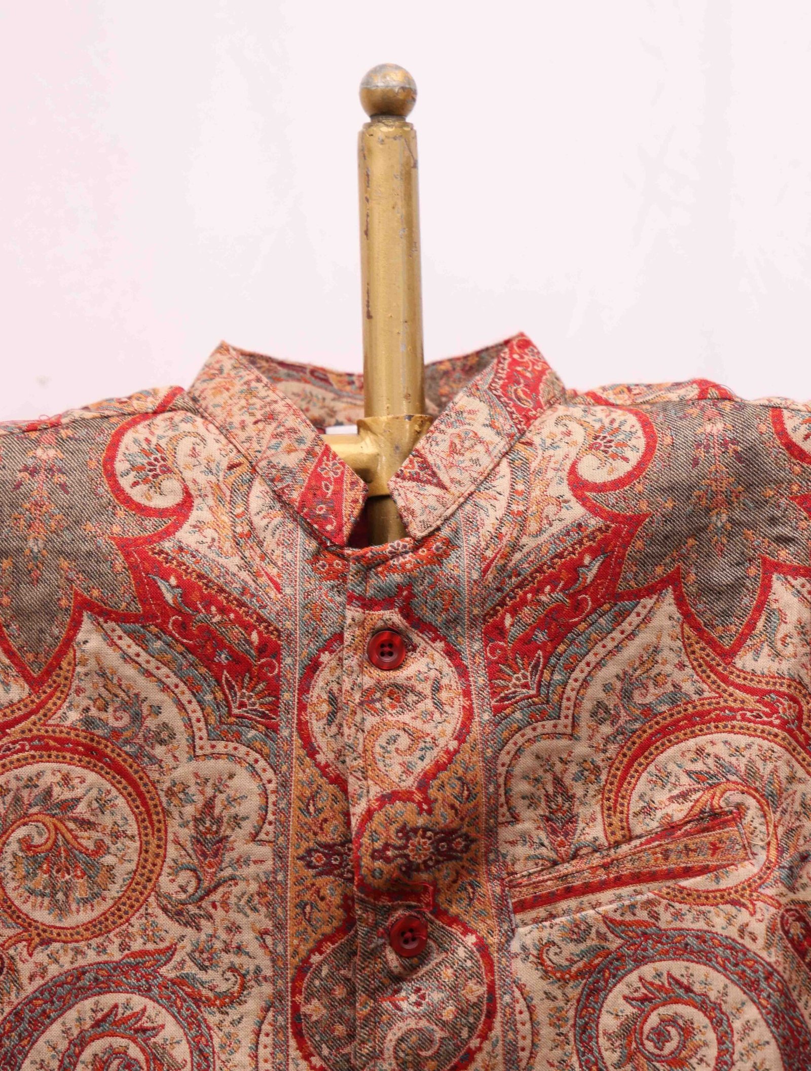 - The Maroon and Ivory Kani Woven Sleeveless Men’s Jacket is a masterful fusion of traditional craftsmanship and contemporary style.