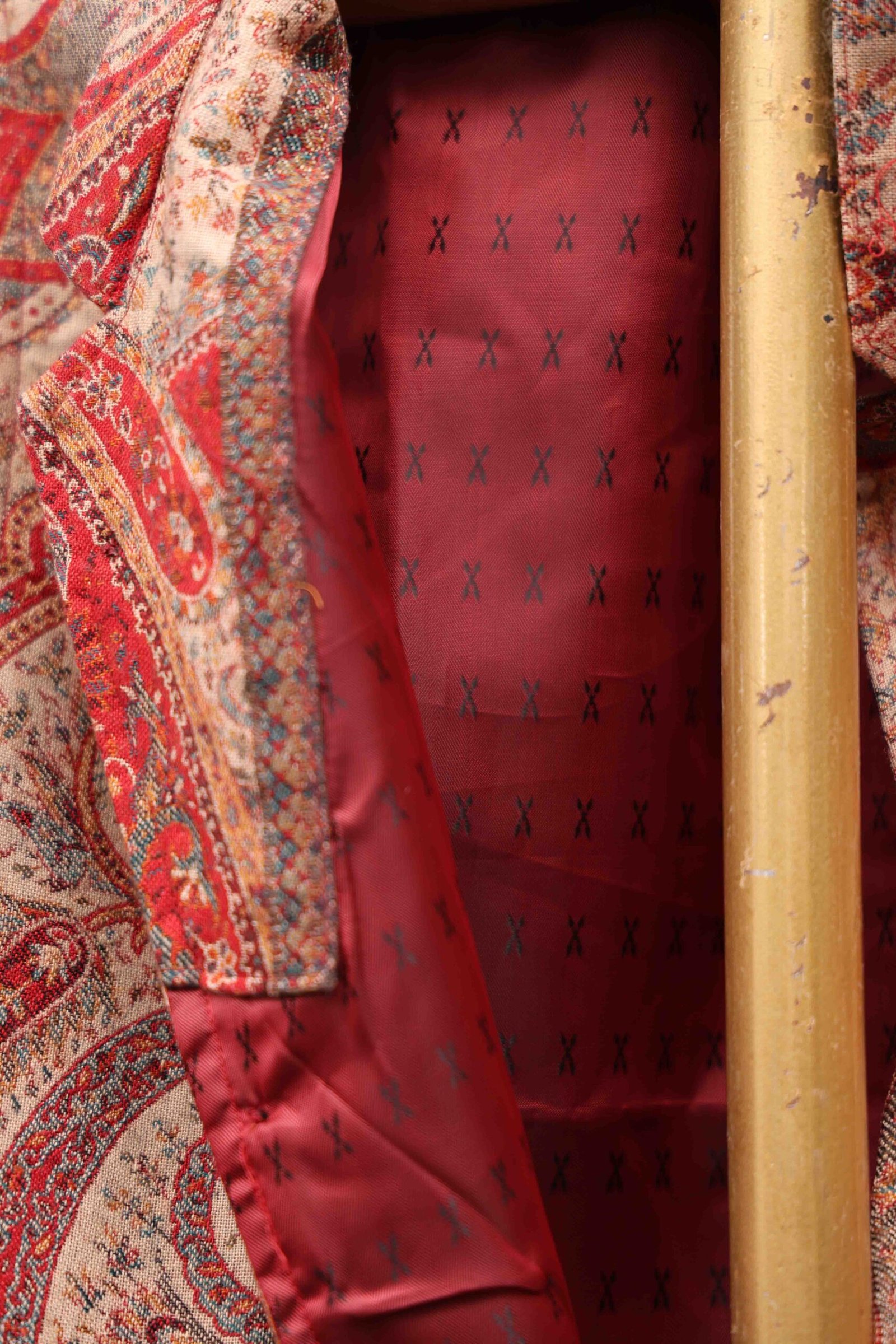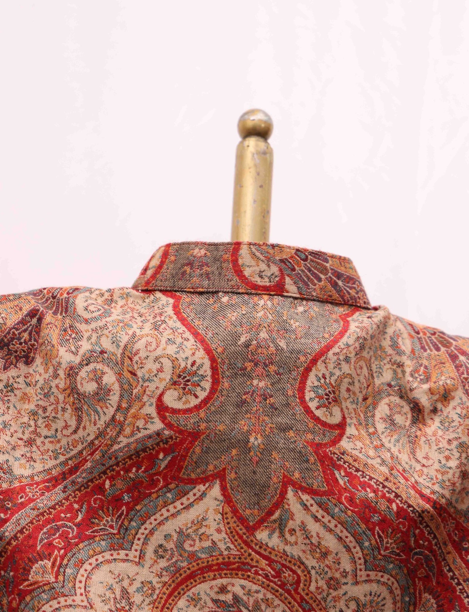 - Meticulously crafted with precision. This jacket showcases the exquisite artistry of Kani weaving. It is a centuries-old technique originating from Kashmir. The intricate patterns and motifs that are woven into the fabric tells a story of cultural richness and heritage.