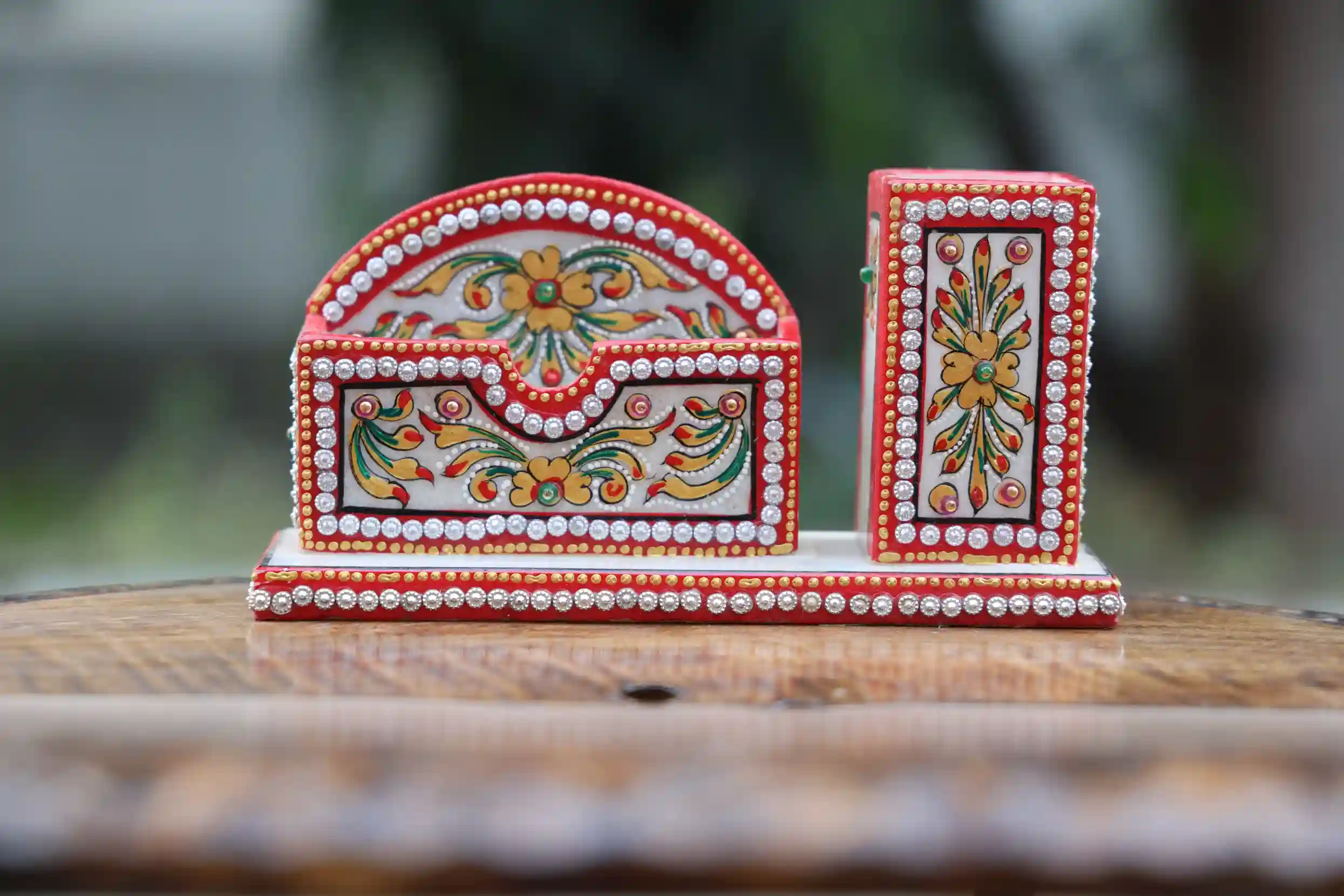 - A harmonious blend of functionality and regal aesthetics. Crafted from pristine marble and adorned with intricate Meenakari work, this dual-purpose accessory seamlessly combines a pen stand and a visiting card holder.