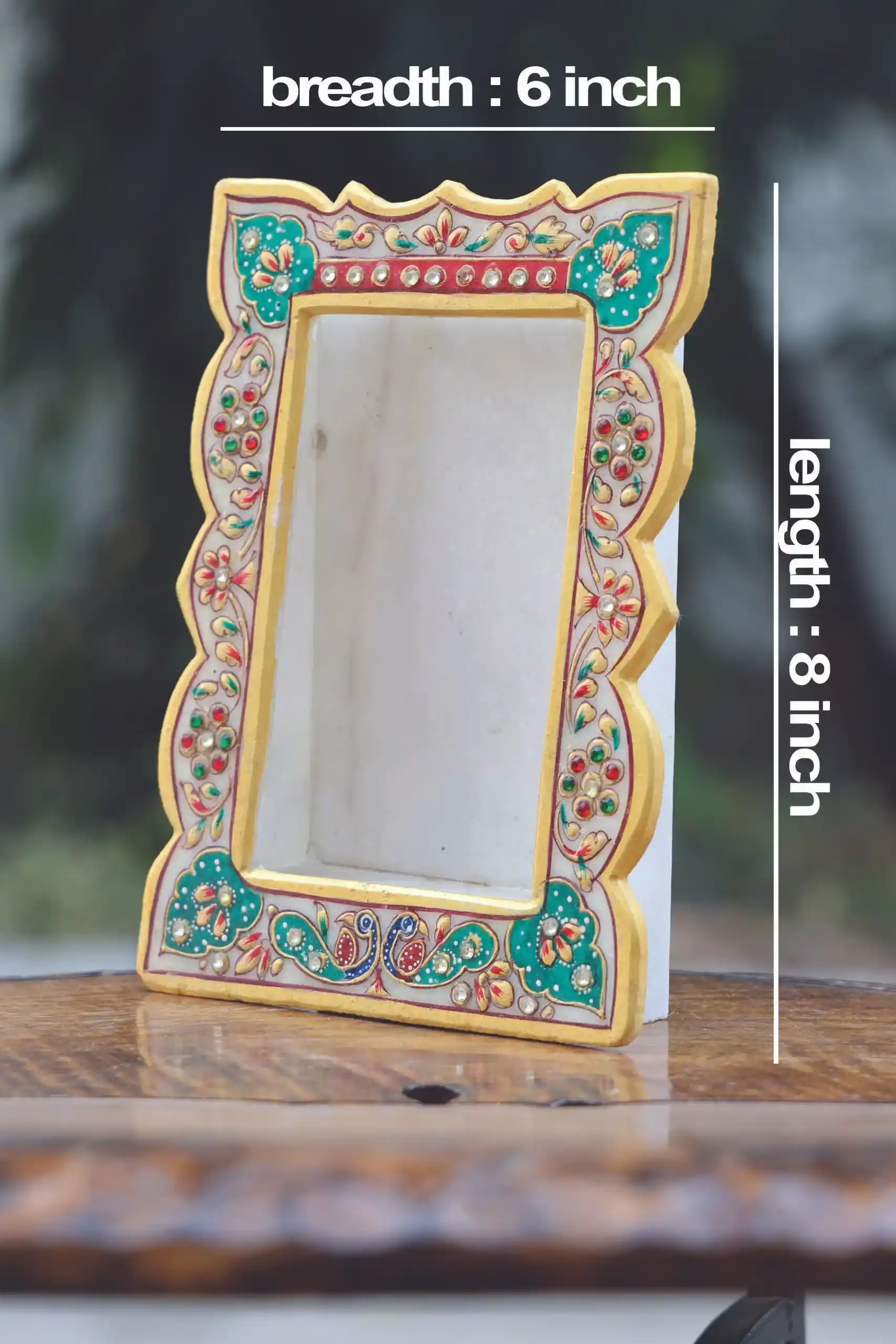 - The intricate Meenakari detailing in vibrant colors enhances the classic white marble, creating a captivating visual appeal. Ideal for showcasing your cherished memories, this photo frame adds a touch of opulence to any space.