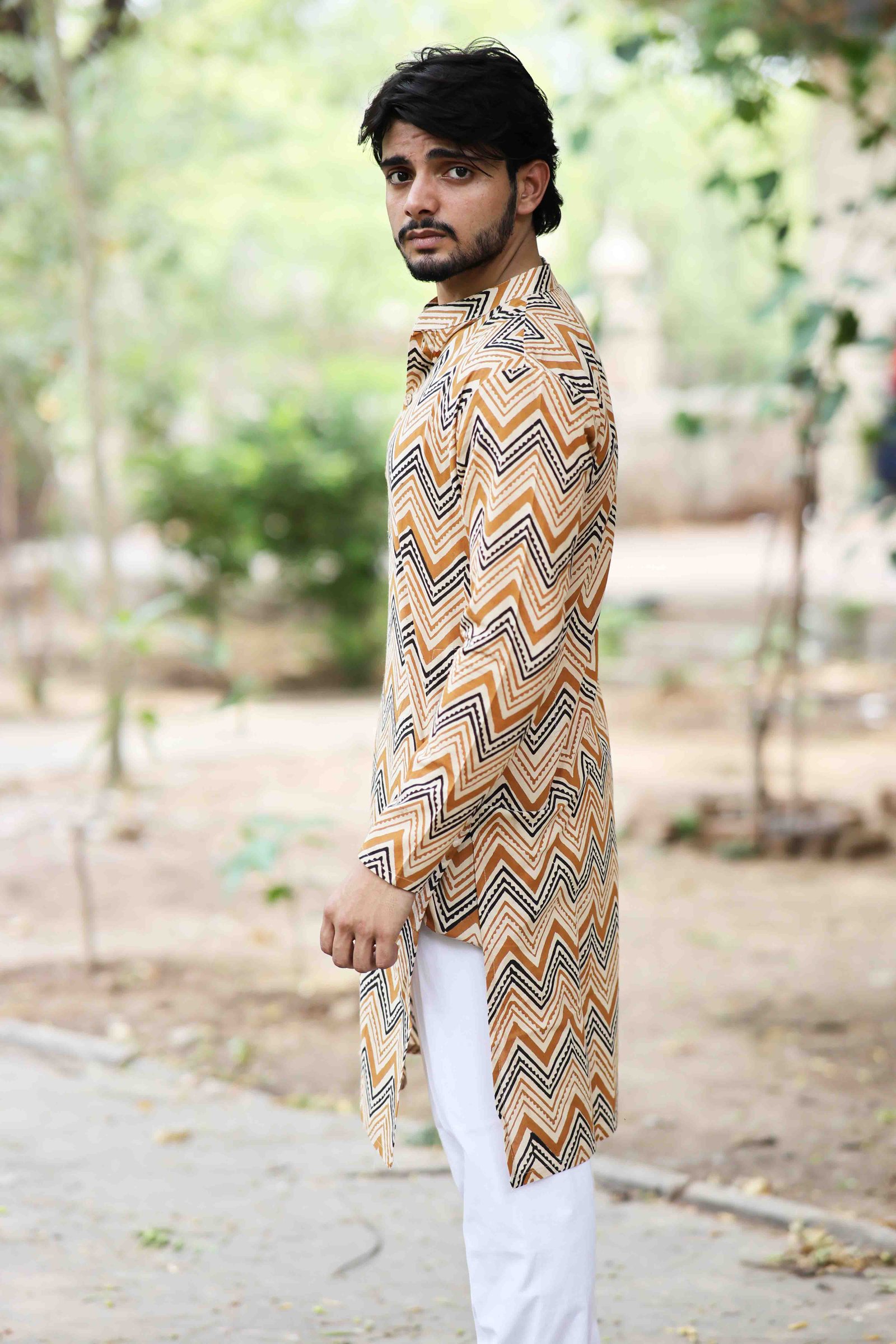 Handcrafted Elegance: Mustard Zig-Zag Cotton Kurta