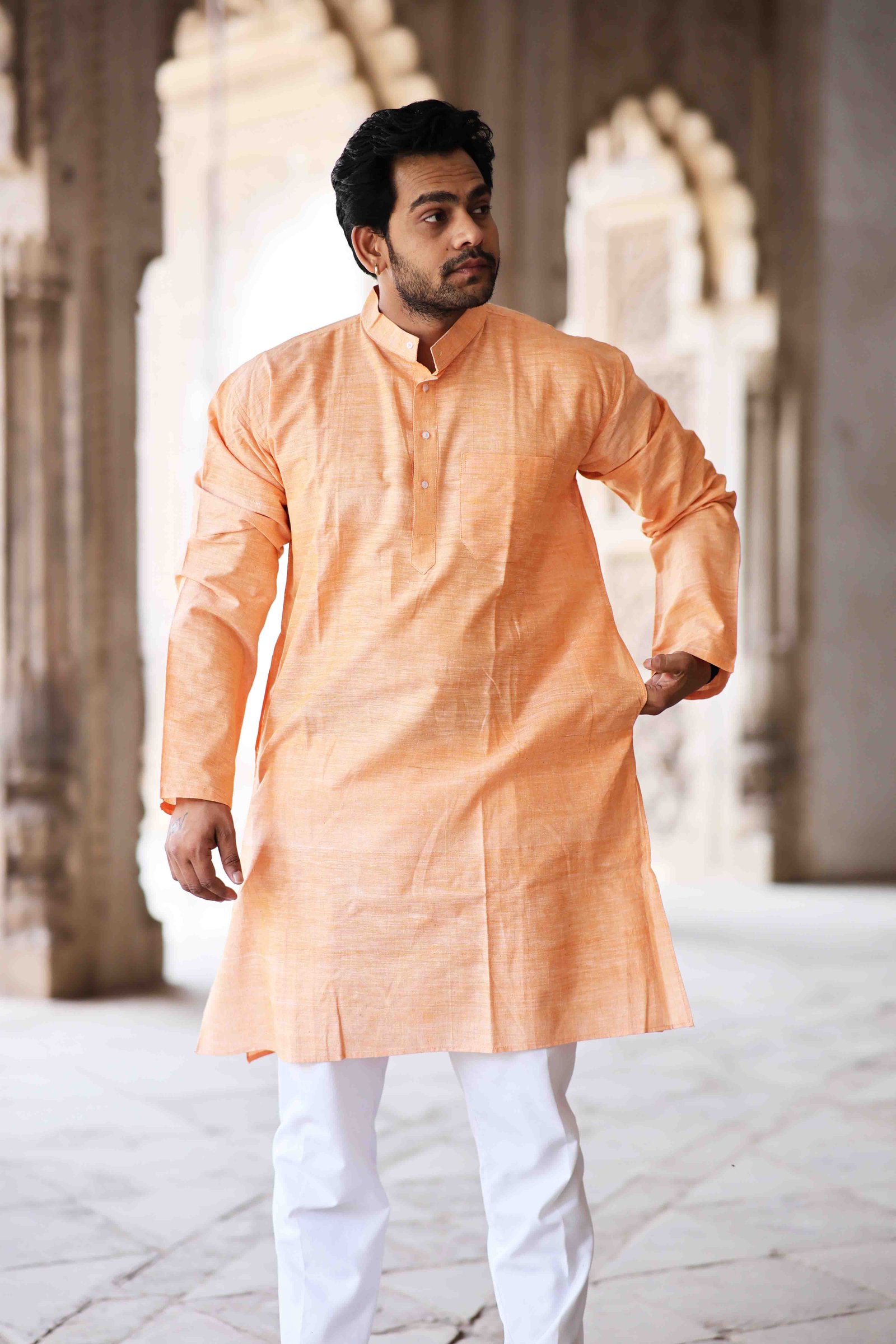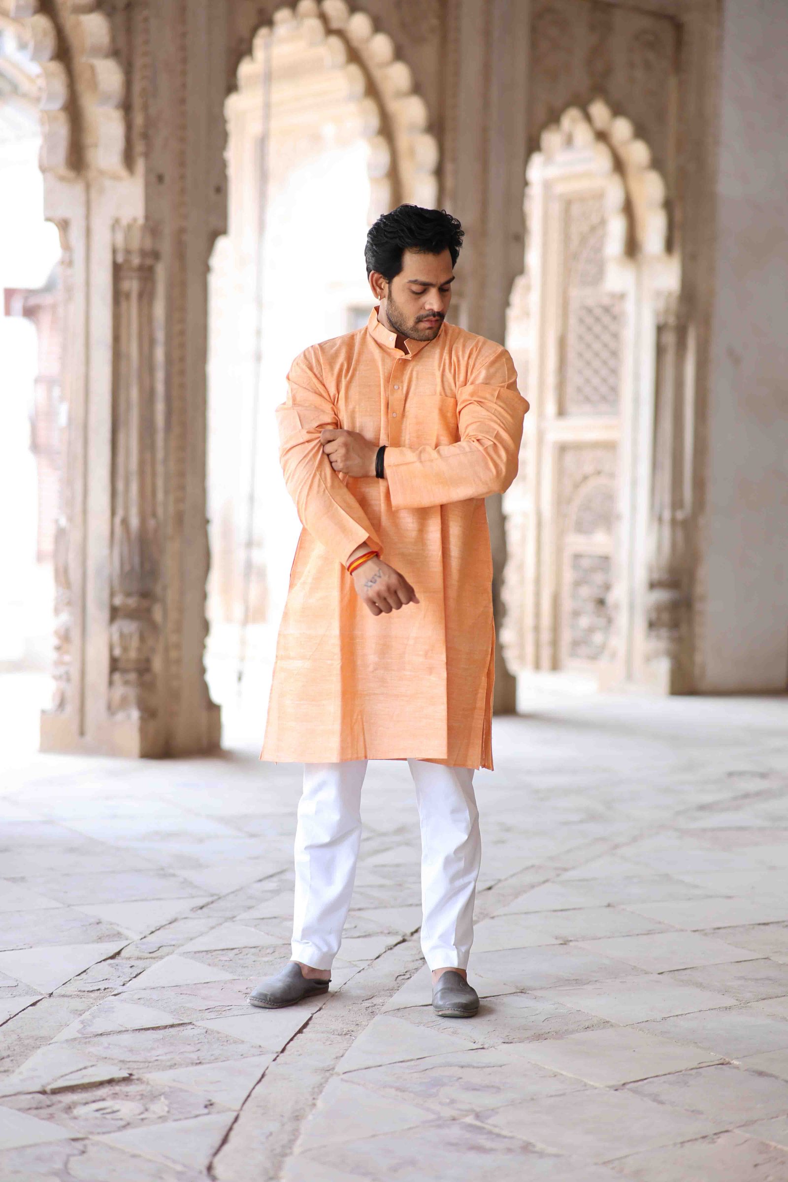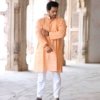 The Jijivisha Collection embraces the beauty of handcrafted elegance, and the peach hand-woven full-sleeves kurta is a true reflection of that spirit. Made from soft, breathable fabric, this kurta features subtle texture and artisanal feature that highlight traditional craftsmanship. The soothing peach tone adds a gentle charm, perfect for day-to-day wear or relaxed festive gatherings. Full sleeves and a tailored silhouette offer both comfort and style, making it a versatile wardrobe essential. Designed for those who cherish slow fashion and meaningful details, this kurta from the Jijivisha Collection celebrates life, tradition, and individuality with grace and quiet confidence