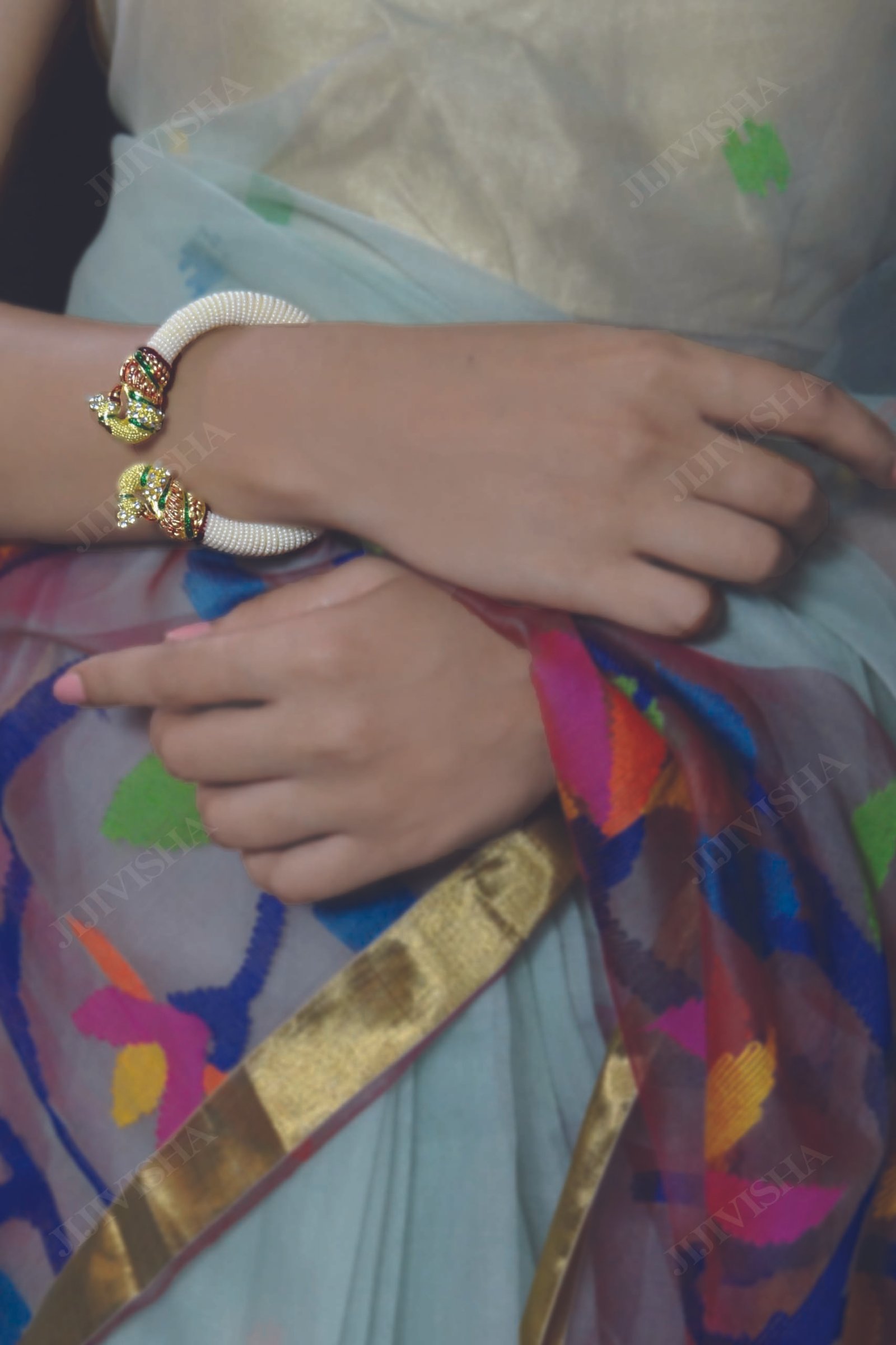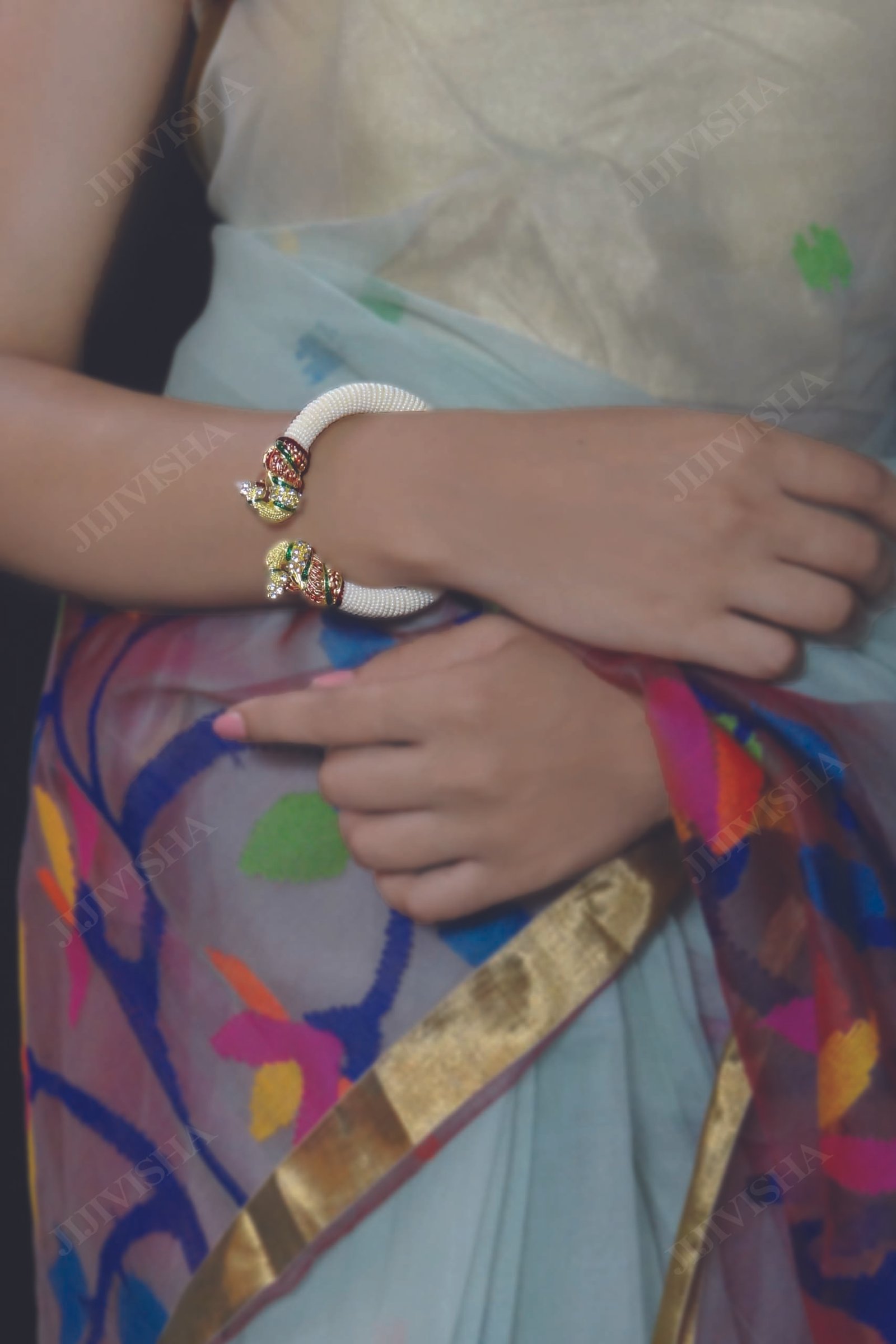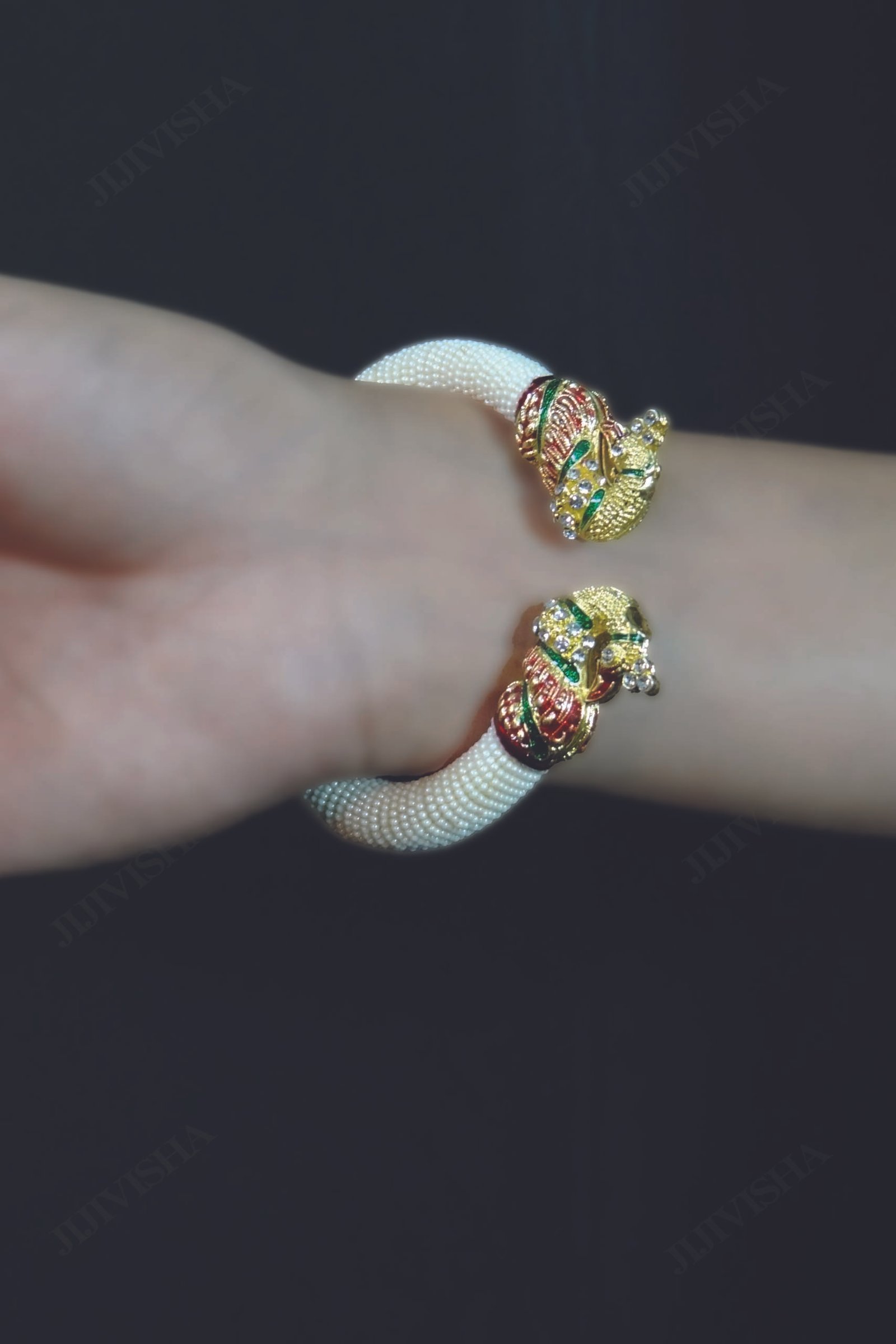 • Ivory peacock ends beaded adjustable cuff is a beautiful piece of jewelry that is handcrafted with intricate beadwork. The cuff features a stunning design of peacock on either end, which are adorned with small beads. The adjustable cuff allows for a perfect fit on any wrist size, making it a versatile accessory that can be worn with a variety of outfits. The intricate beadwork and attention to detail make this cuff a true work of art that is sure to turn heads and add a touch of elegance to any look. The cuff has been molded to perfection from metal. The bead work bangle is polished to a high shine and wont turn dull. It is convenient to wear all day long.