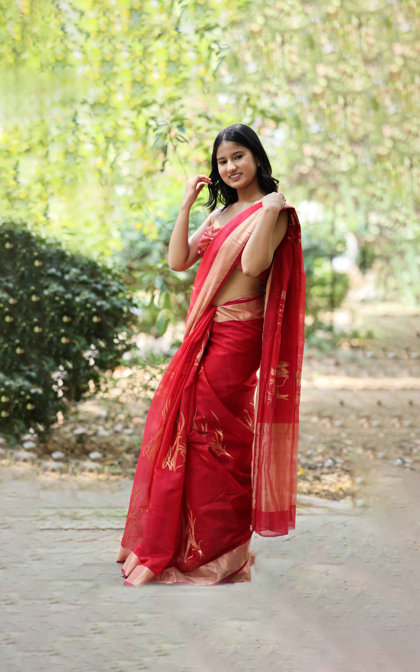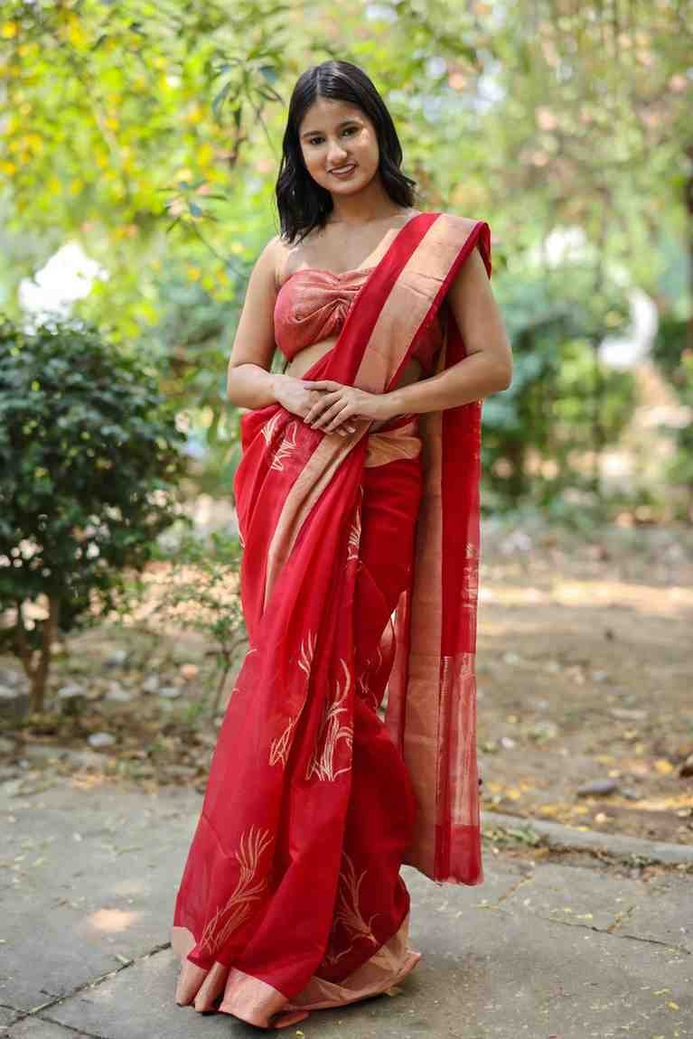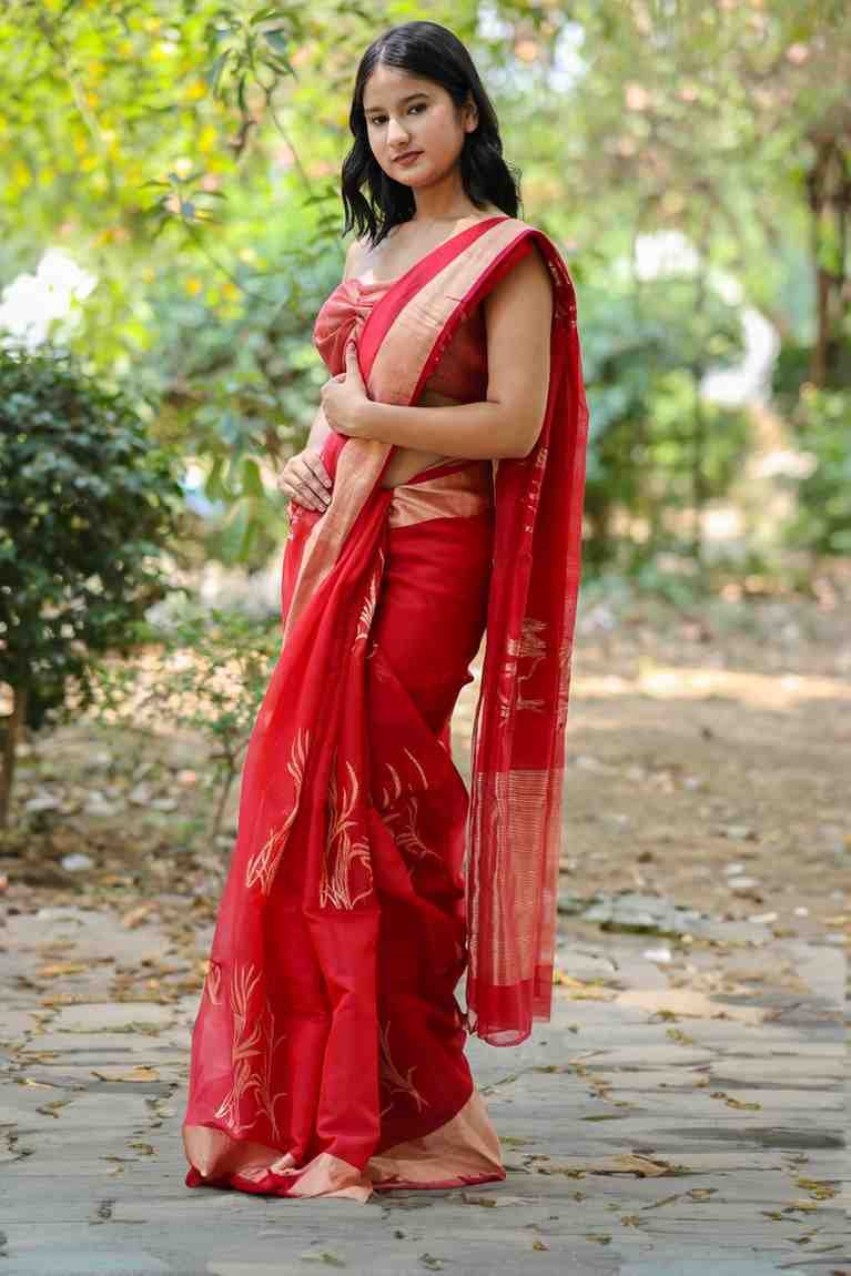 • Fabric: Handwoven Chanderi silk with golden motifs