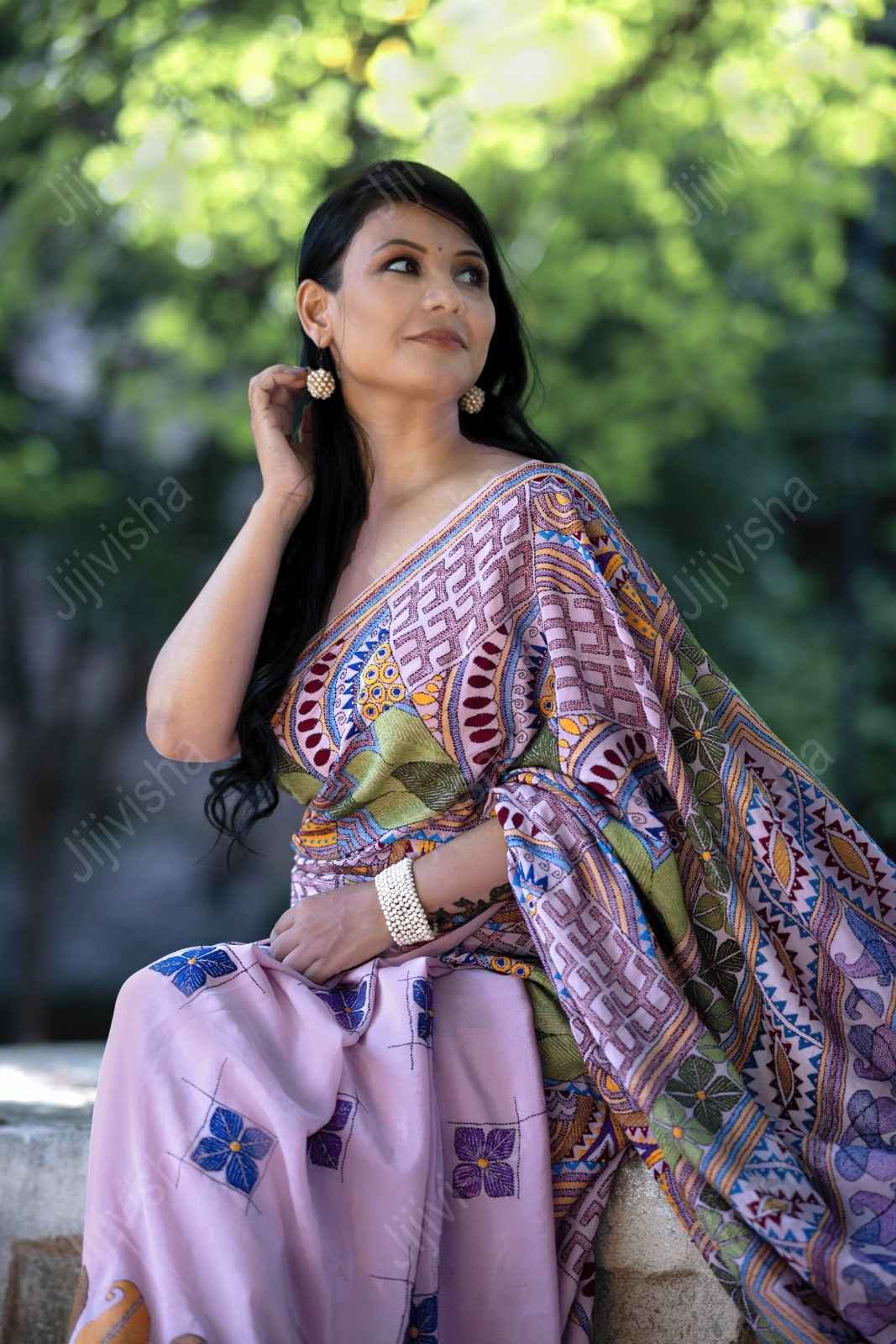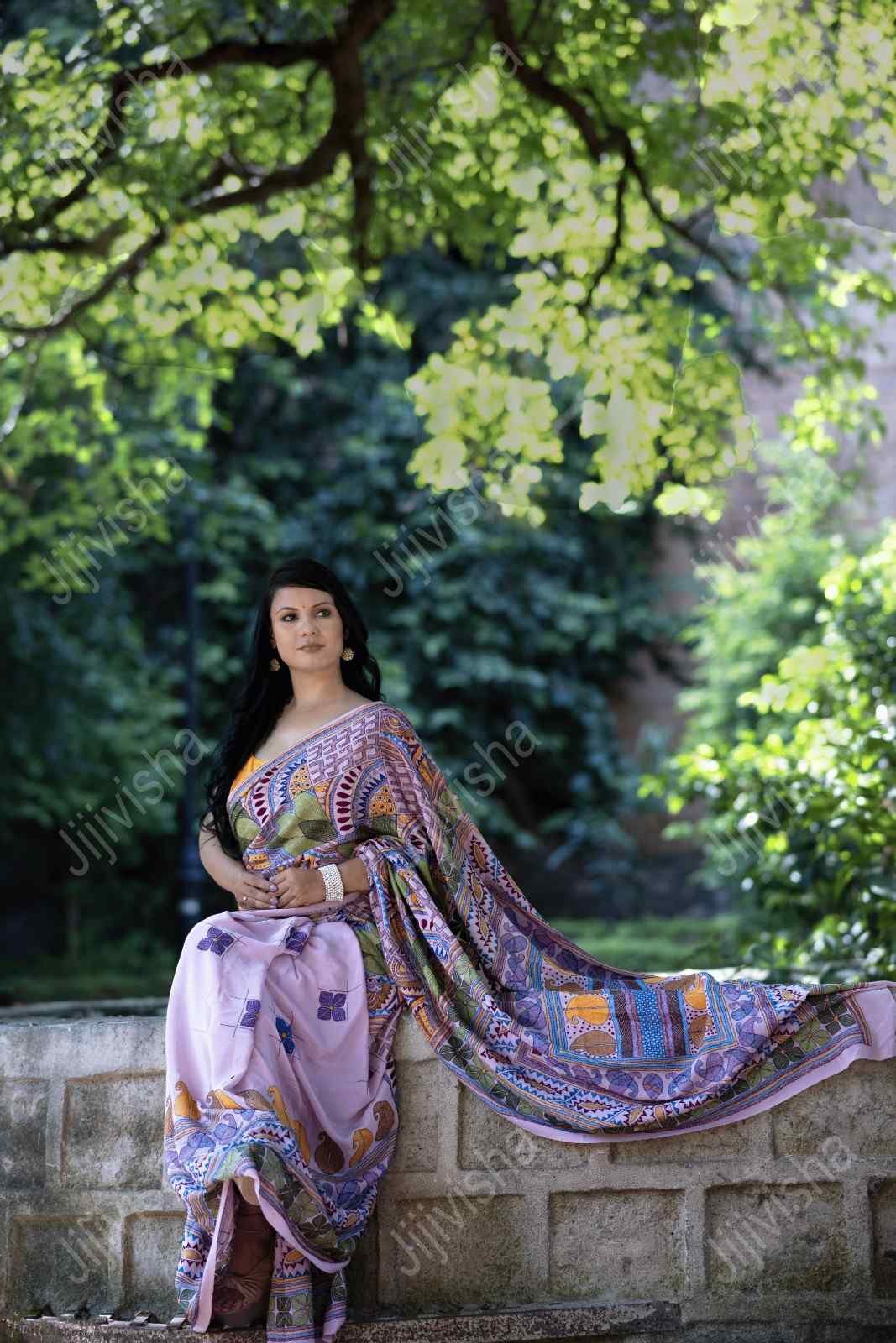 This pure crepe saree in a soft pink shade is brought to life with vibrant multicolored Kantha hand embroidery. Intricate stitching, carefully crafted by skilled artisans, blossoms into stunning patterns that dance across the smooth fabric. Each thread tells a story of tradition, love, and dedication, infusing the design with warmth, charm, and a touch of playful elegance showcasing beautiful patterns. The soft crepe fabric, paired with the vibrant Kantha hand embroidery, creates a refreshing and standout masterpiece. Shop now this exquisite piece online at Jijivisha, India, and let this add a touch of color and joy to your ensemble.