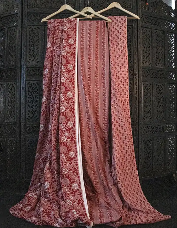 This pink floral hand block printed trio is a charming set perfect for adding elegance to your collection.Crafted from soft,breathable cotton,each piece showcases intricate floral motifs created using traditional hand block printing techniques.The delicate pink base is adorned with detailed patterns in complementry hues,giving it a fresh and graceful appeal.Ideal for creating coordinatedoutfits.home decor accents,or craft projects,this trio offers versatility and beauty in equal measure.The artisanal touch ensures every piece is unique,carrying the warmthod hand made artistry.