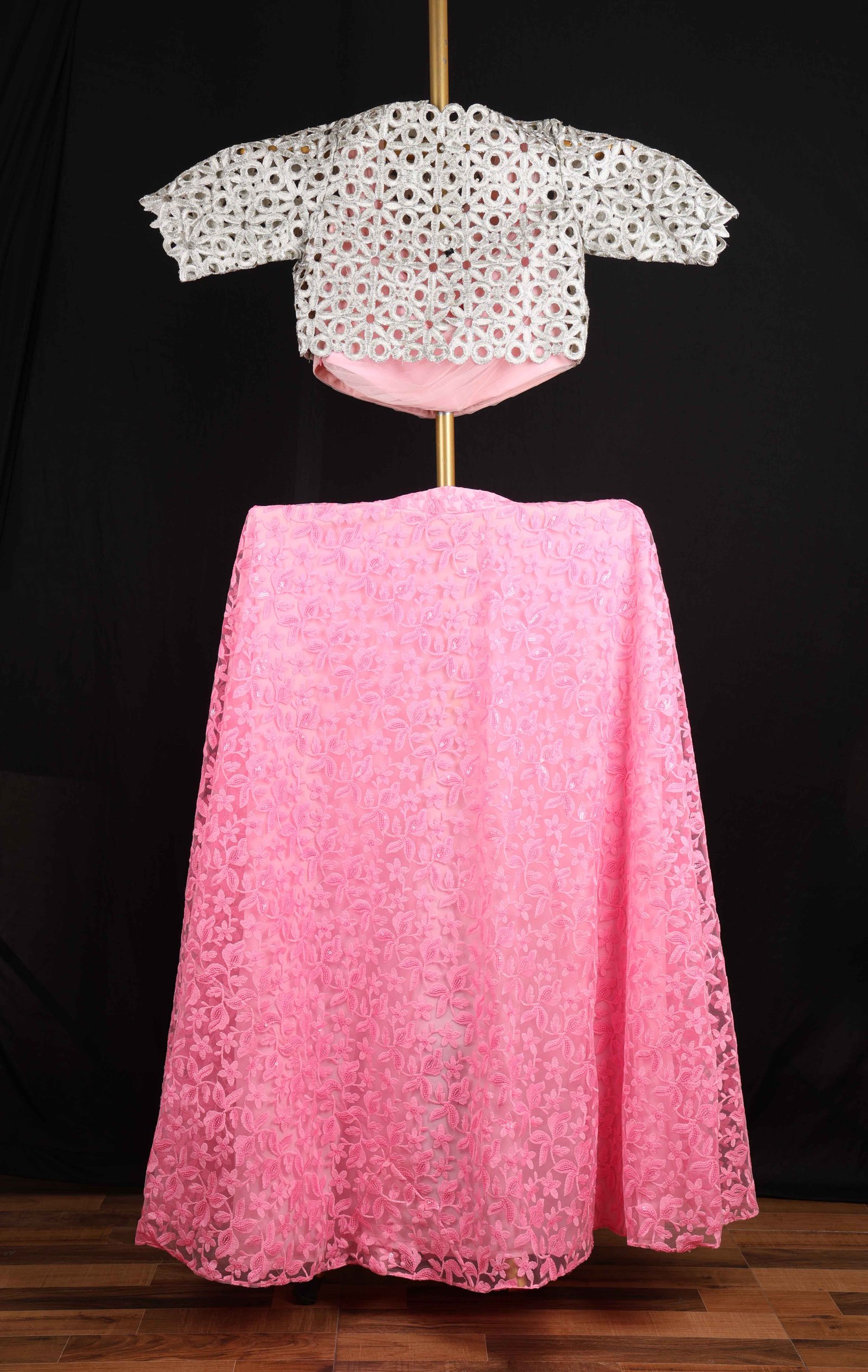 The Jijivisha Collection showcases a stunning pink georgette lehenga adorned with intricate all-over floral jaal embroidery, exuding a soft, romantic charm. Paired with a sleeveless pleated blouse crafted from delicate net fabric, it features a concealed zipper for a sleek, modern look. Completing the ensemble is a silver jacket with elbow-length sleeves, meticulously designed with all-over cutwork that adds an elegant, artistic touch. This exquisite combination of floral and metallic details creates a perfect blend of tradition and contemporary style, making it ideal for any special occasion.