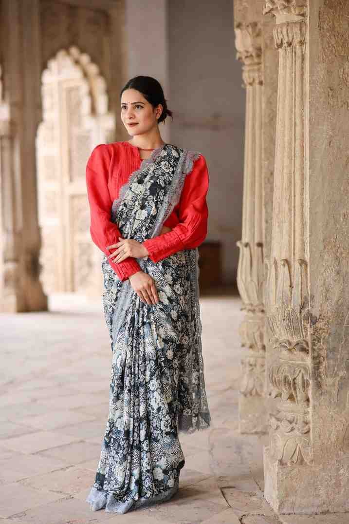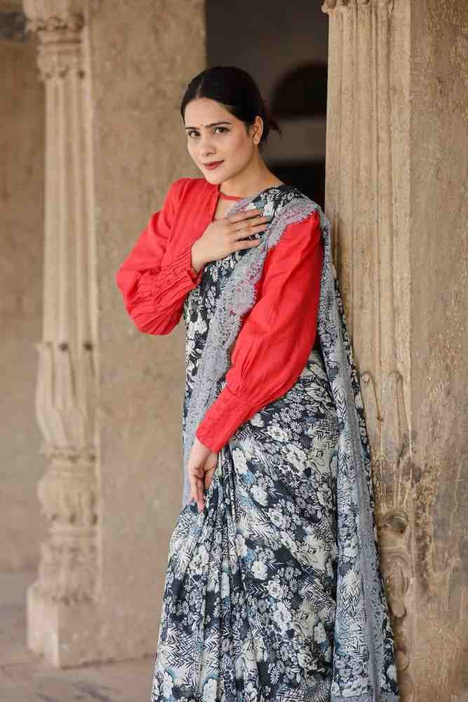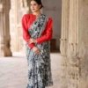 - Make a stylish statement with this vibrant floral saree that’s designed to captivate hearts and turn heads. The trendy design, combined with the lightweight crêpe fabric, ensures that you not only look stunning but also feel comfortable. What sets this ensemble apart is the lace border, adding an elegant touch to the traditional silhouette. Wear this festive saree for any occasion and radiate grace and charm effortlessly.