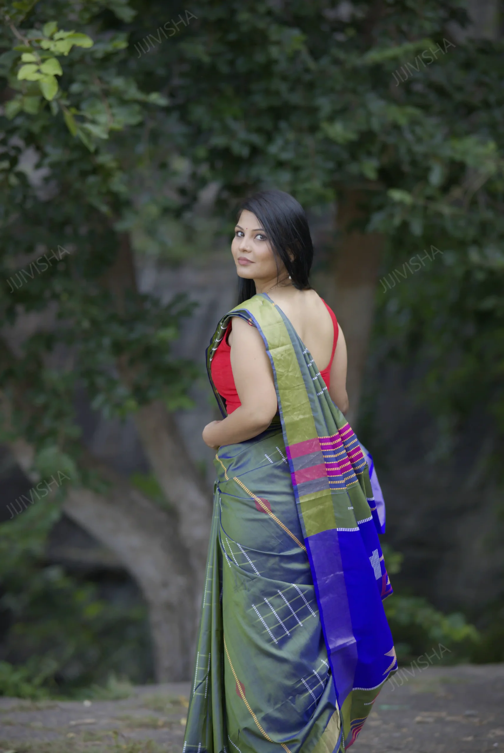 - Experience the allure of tradition and craftsmanship with "Rajat Paridhi," celebrating the majestic blend of Dark Olive Green and Royal Blue in this Bishnupuri Pure Silk Kalakhetra Handspun Handwoven Saree.